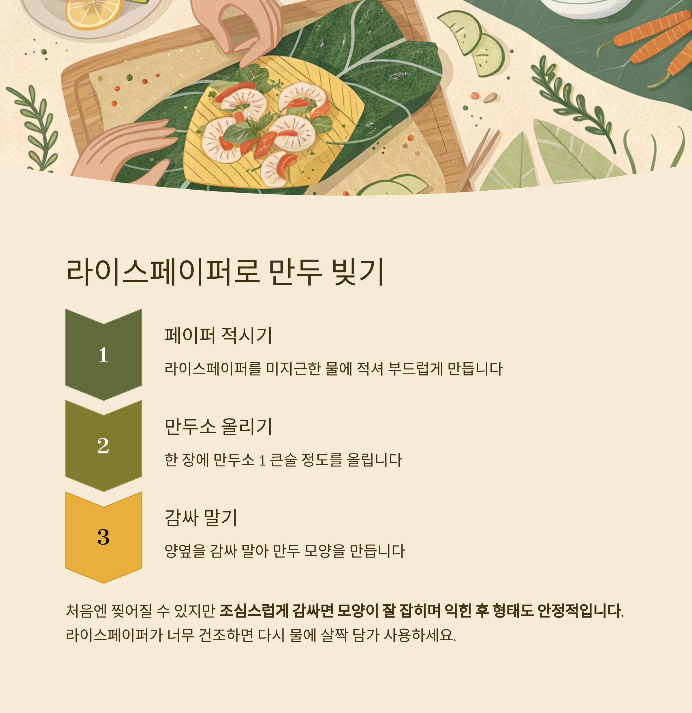 처음엔 찢어질 수 있지만 조심스럽게 감싸면 모양이 잘 잡히며 익힌 후 형태도 안정적입니다.