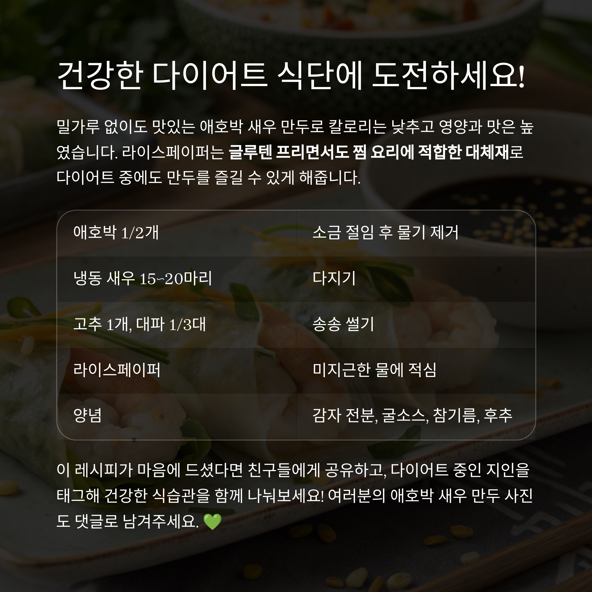 애호박과 새우, 그리고 라이스페이퍼를 활용한 저탄수 만두 레시피입니다.