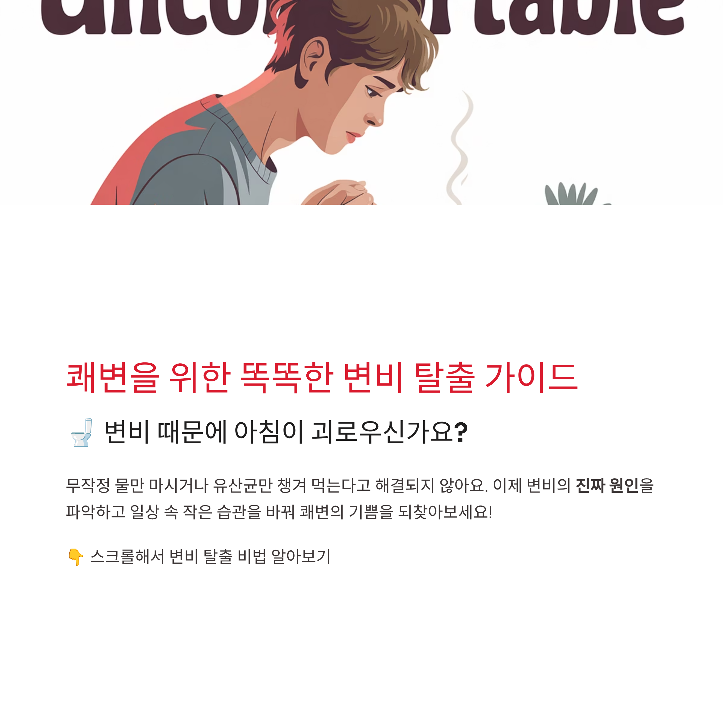 이제 변비의 원인을 정확히 알고 똑똑하게 해결해 보세요! 쾌변은 건강하고 행복한 하루의 시작입니다. 😊
