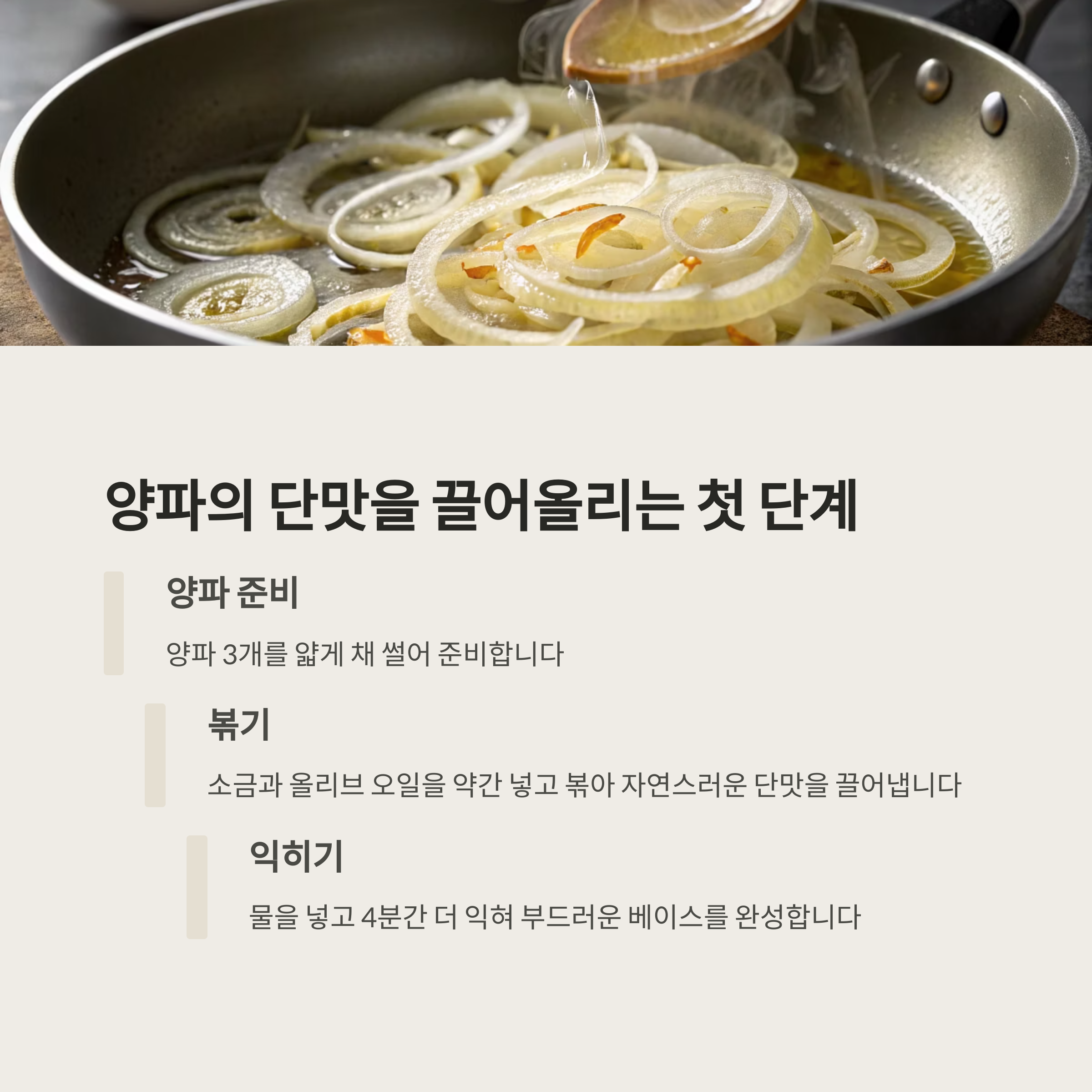 | 양파 | 4분 | 단맛 추출, 부드러운 식감 |