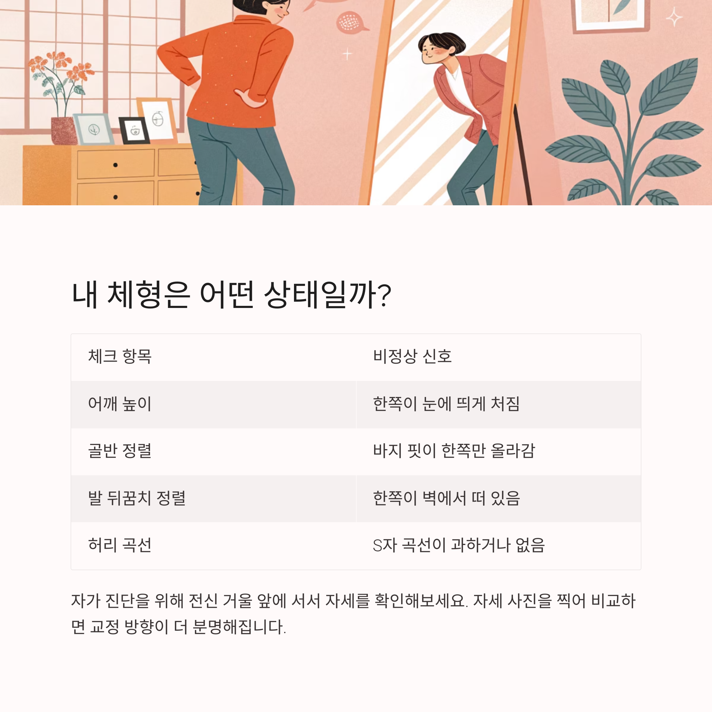 | 골반 정렬 | 거울 앞에서 양쪽 골반 위치 보기 | 바지 핏이 한쪽만 올라감 |