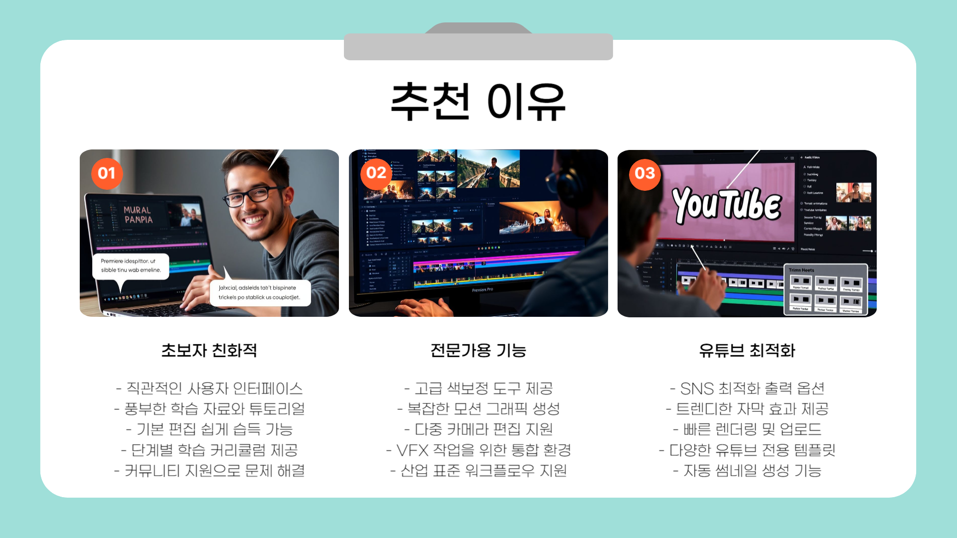 프리미어 프로는 직관적인 UI와 학습 자료 덕분에 초보자도 쉽게 적응할 수 있습니다. 유튜브에는 수많은 무료 강좌가 제공되며, 기본적인 컷 편집과 효과 적용은 몇 시간 내에 익힐 수 있습니다.