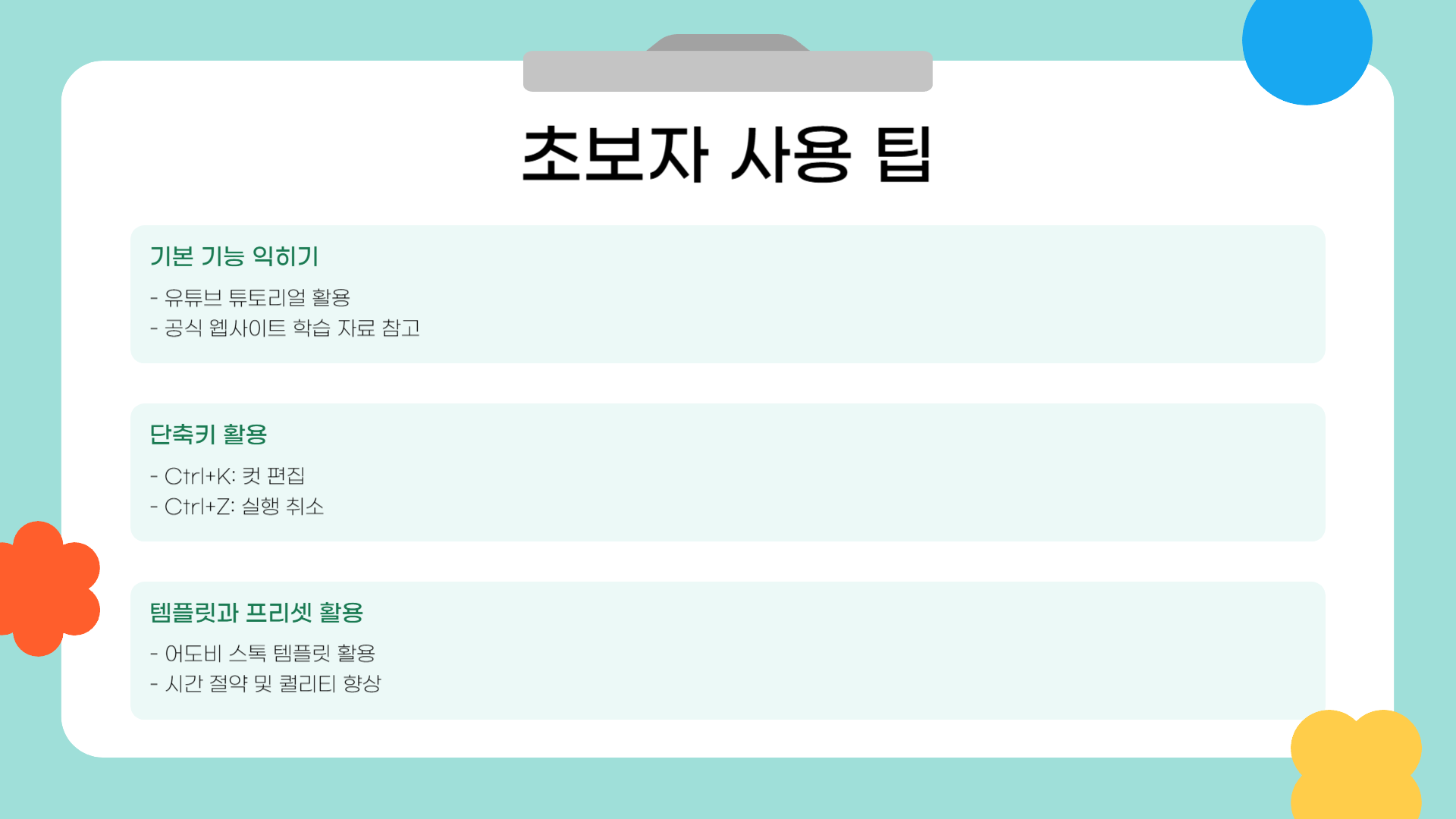 유튜브나 어도비 공식 웹사이트에서 제공하는 튜토리얼을 활용해 기초를 익히세요.
