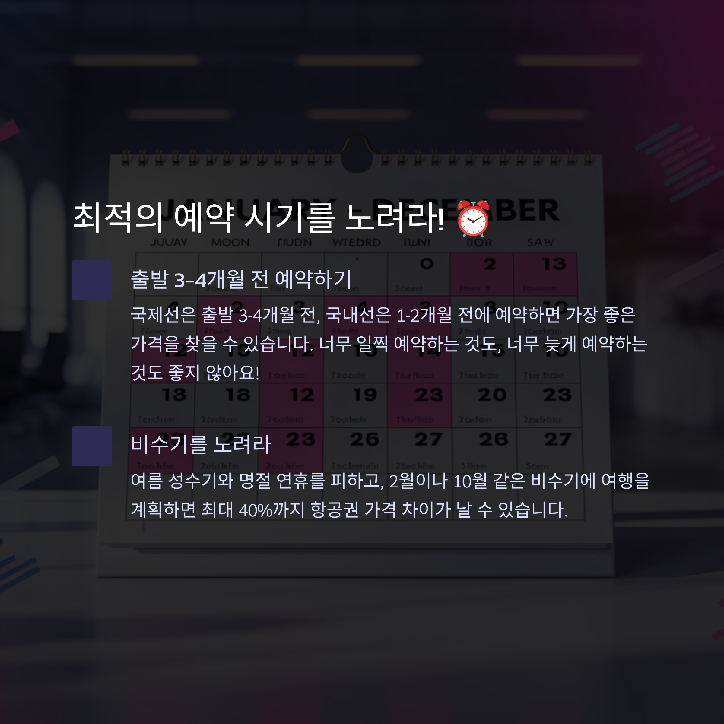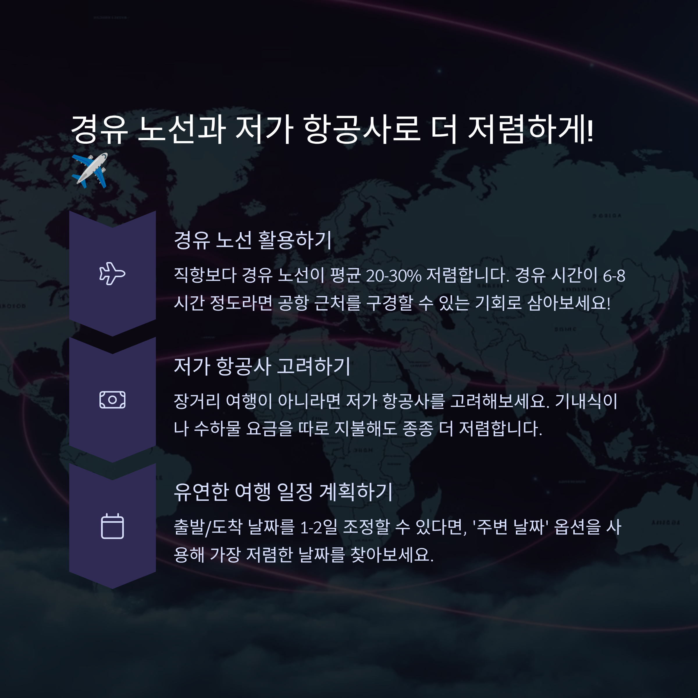 또한, 성수기(여름 휴가, 명절 등)를 피해 비수기에 여행하면 훨씬 저렴한 가격에 항공권을 구할 수 있습니다.