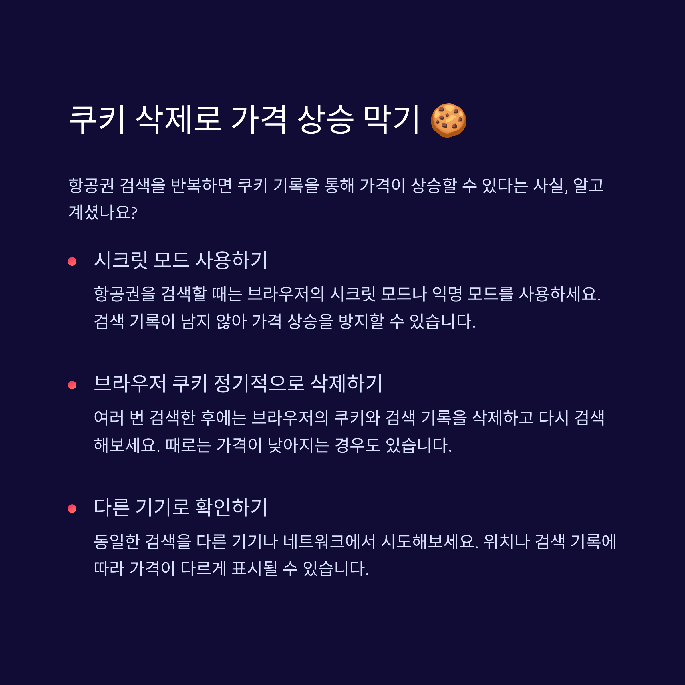 항공권 검색을 자주 하면 웹사이트의 쿠키(사용자 정보)가 저장되어 가격이 상승할 수 있습니다.