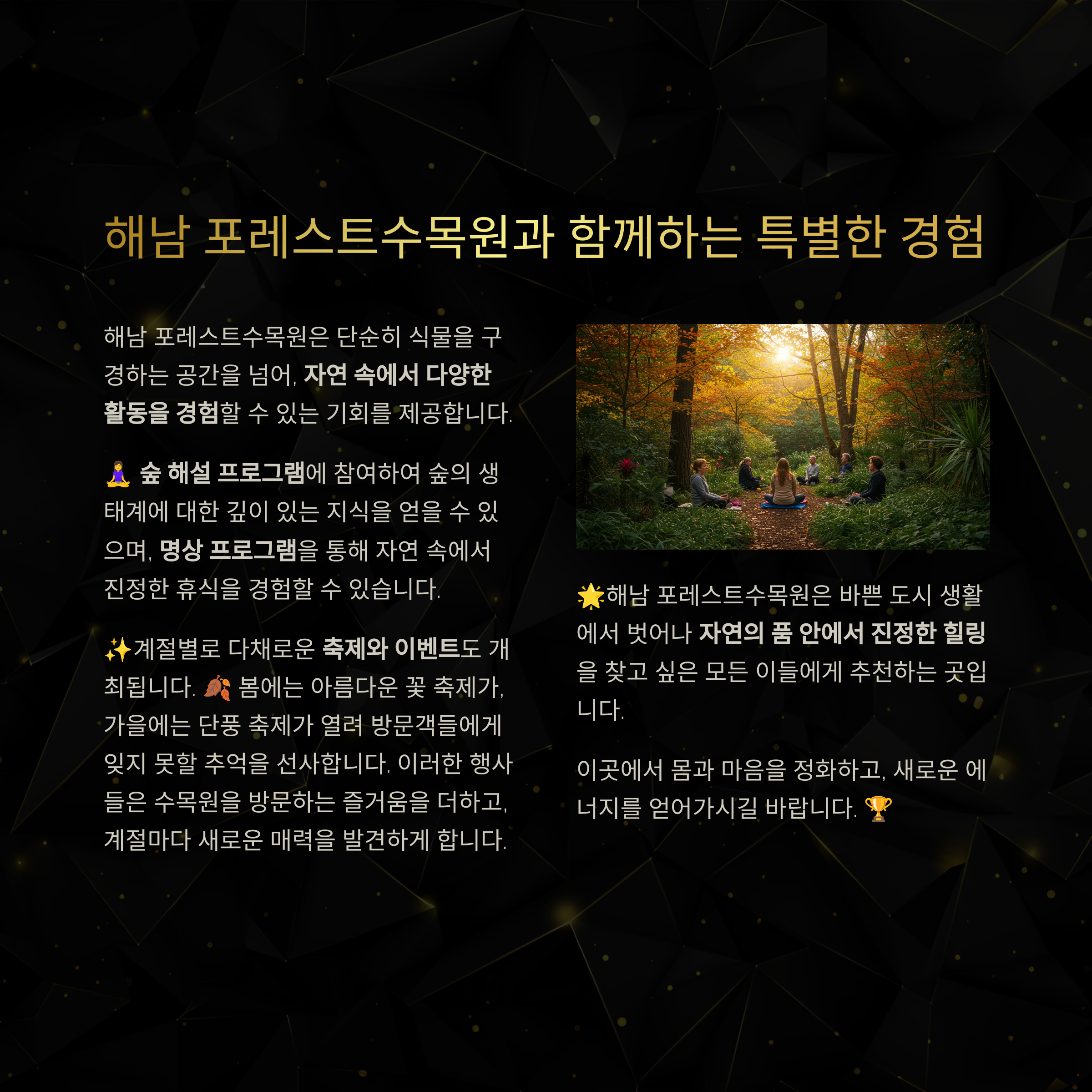 🧘‍♀️ 숲 해설 프로그램에 참여하여 숲의 생태계에 대한 깊이 있는 지식을 얻을 수 있으며,