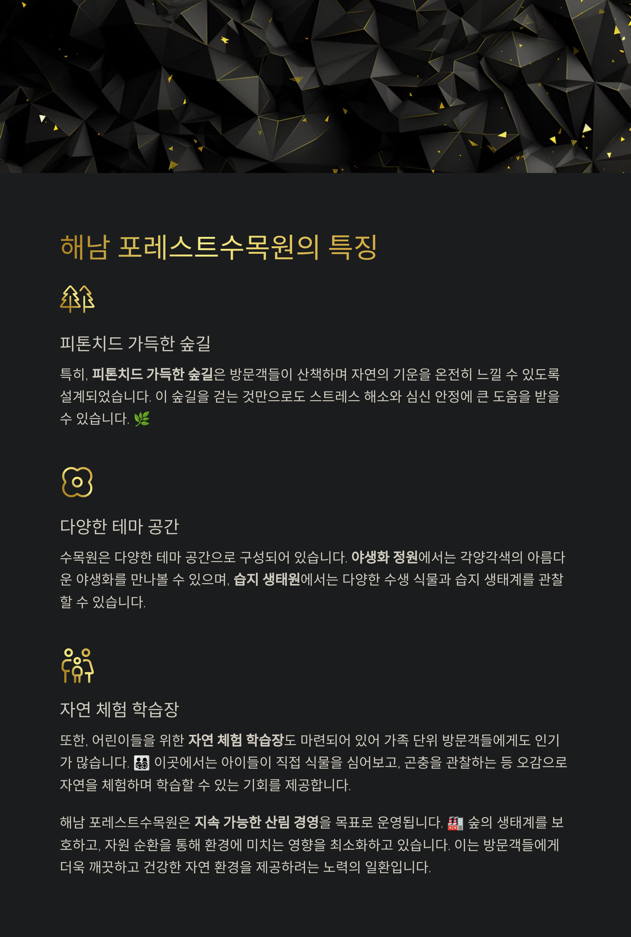 해남 포레스트수목원은 지속 가능한 산림 경영을 목표로 운영됩니다.