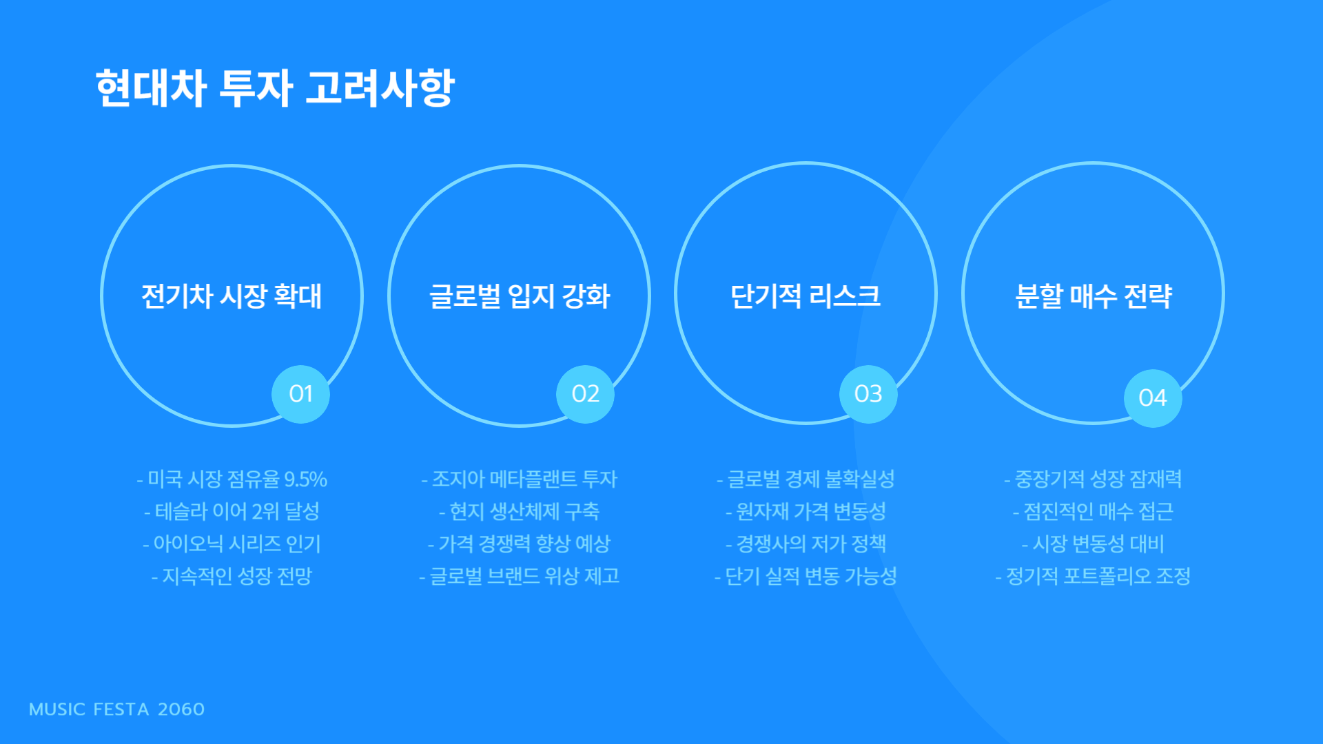 다만, 글로벌 경제 불확실성과 원자재 가격 상승, 중국산 전기차의 저가 공세 등은 현대차가 해결해야 할 과제로 지적되고 있어요. 이에 따라 전문가들은 단기적인 투자보다 중장기적 관점에서의 분할 매수 전략을 추천하고 있답니다. 💡