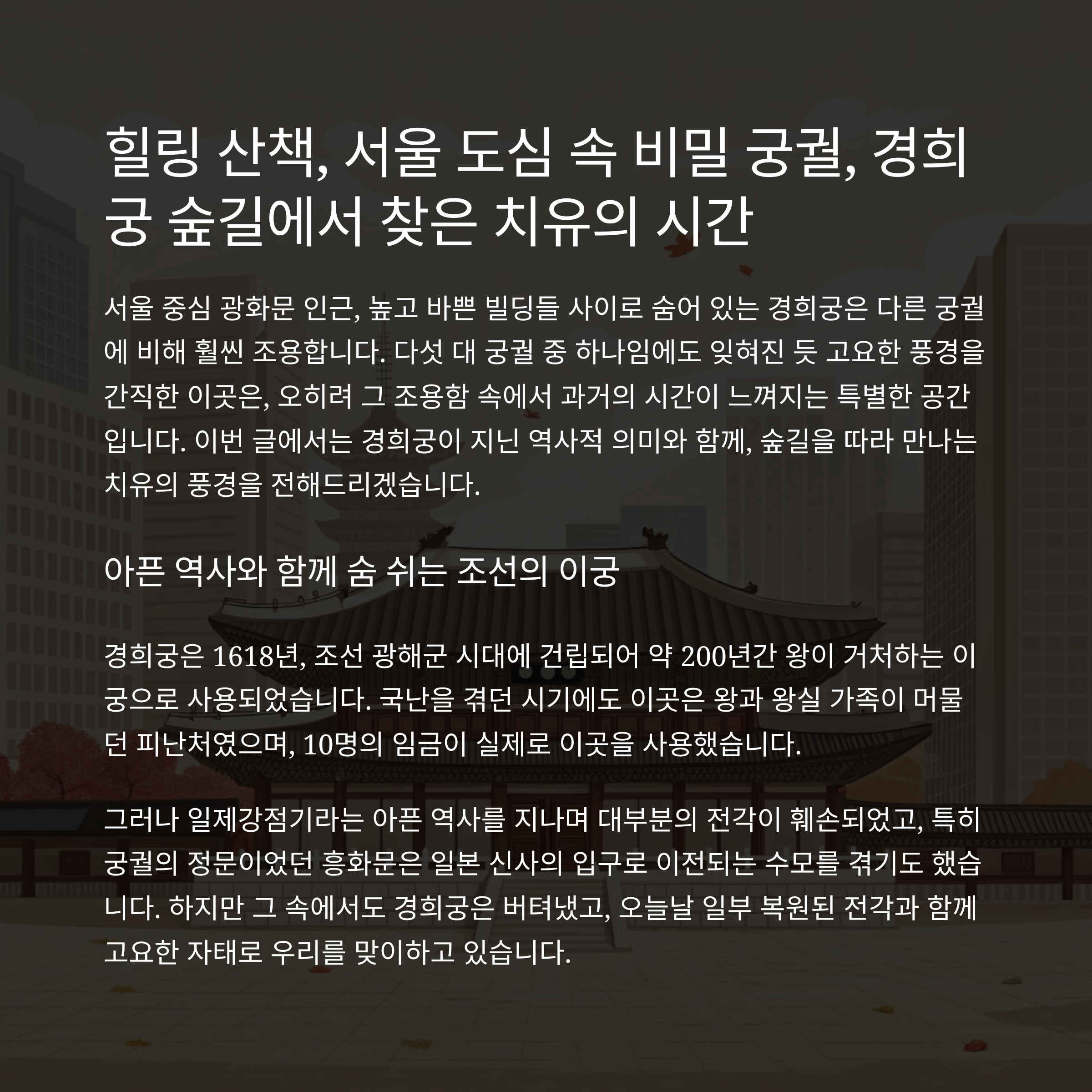서울 중심 광화문 인근, 높고 바쁜 빌딩들 사이로 숨어 있는 경희궁은 다른 궁궐에 비해 훨씬 조용합니다. 다섯 대 궁궐 중 하나임에도 잊혀진 듯 고요한 풍경을 간직한 이곳은, 오히려 그 조용함 속에서 과거의 시간이 느껴지는 특별한 공간입니다. 이번 글에서는 경희궁이 지닌 역사적 의미와 함께, 숲길을 따라 만나는 치유의 풍경을 전해드리겠습니다.
