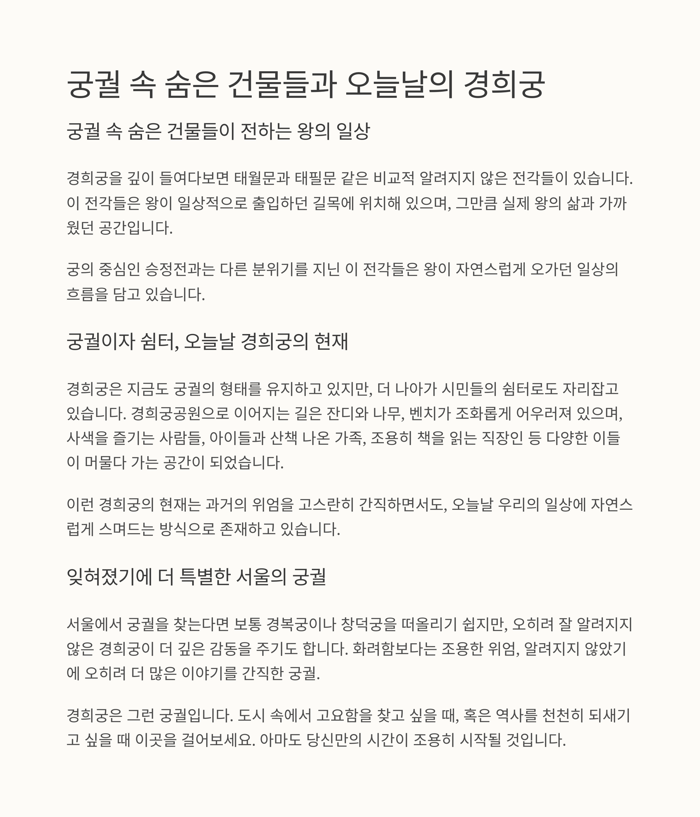 경희궁은 그런 궁궐입니다. 도시 속에서 고요함을 찾고 싶을 때, 혹은 역사를 천천히 되새기고 싶을 때 이곳을 걸어보세요. 아마도 당신만의 시간이 조용히 시작될 것입니다.