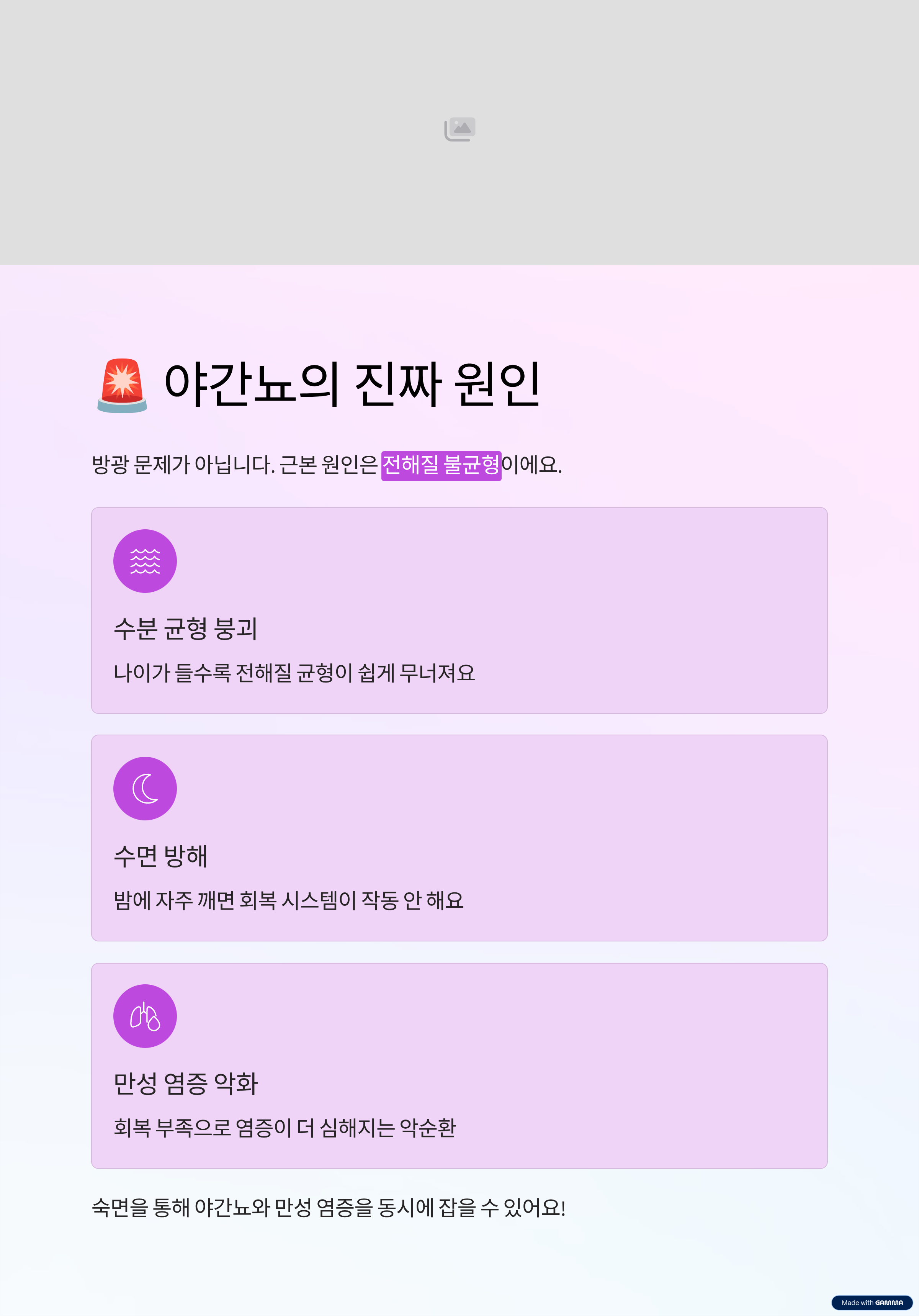 결국, 야간뇨를 잡는 것은 곧 **'숙면'**을 통해 만성 염증까지 억제하는 길인 셈입니다.
