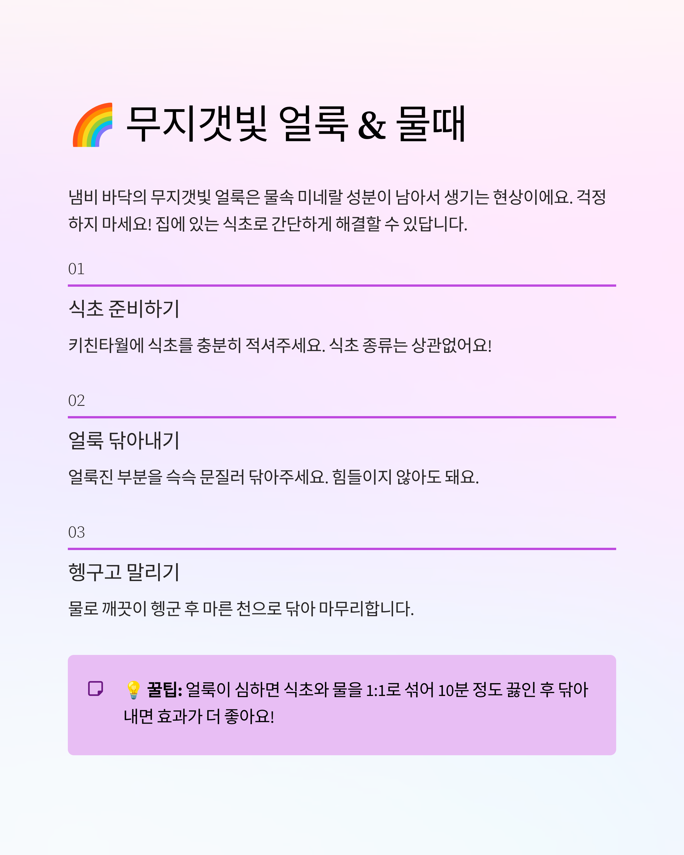 1. 🌈 무지갯빛 얼룩 & 물때 (Feat. 식초)