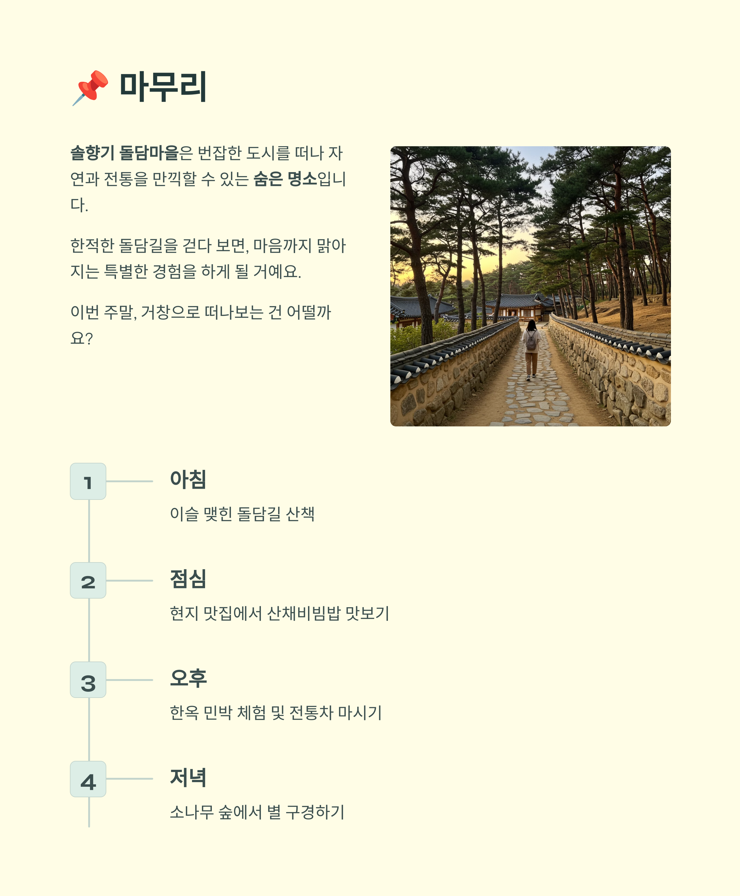 - 주차장: 마을 입구 무료 주차장 이용 가능