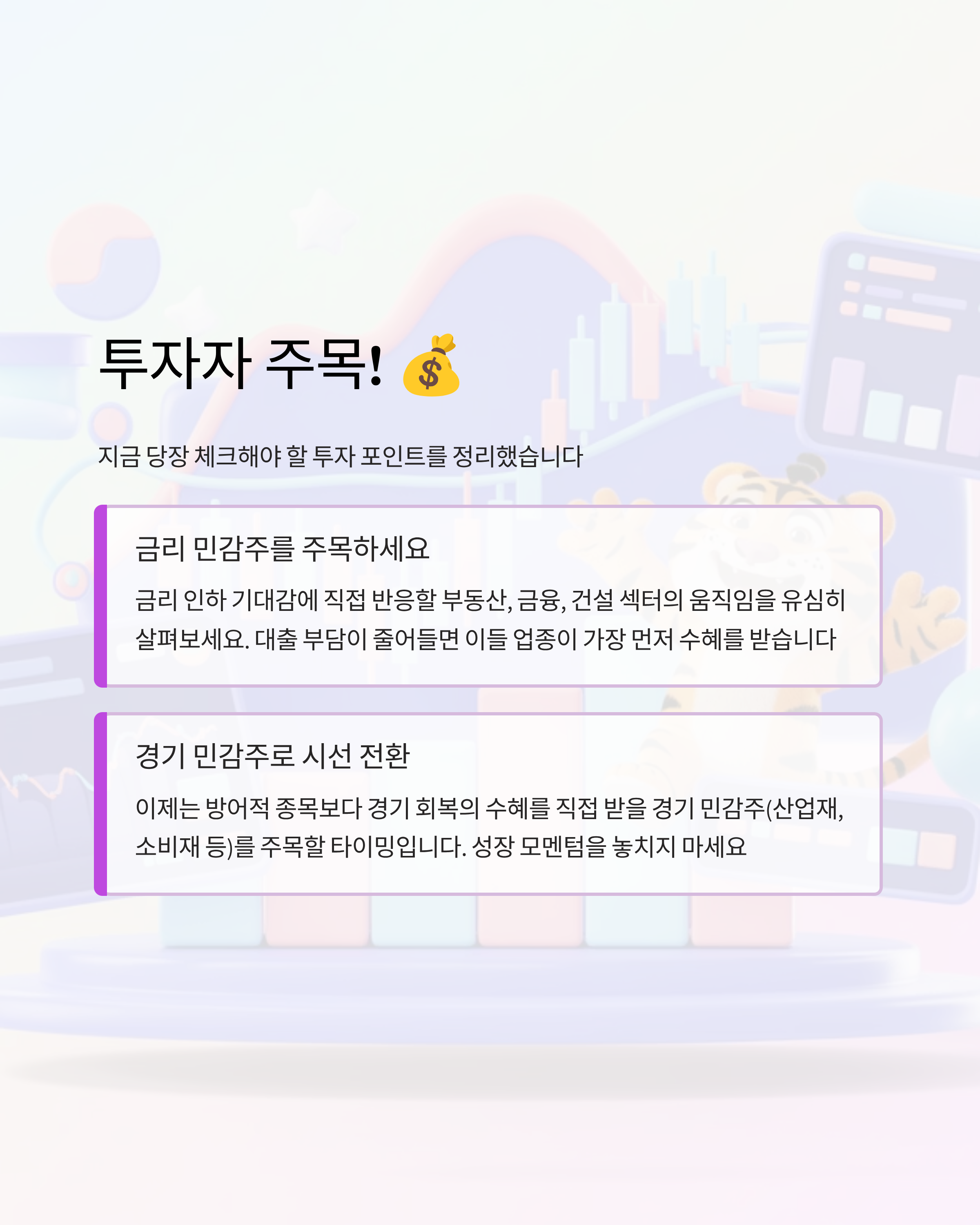 - 금리 민감주: 금리 인하 기대감에 직접적으로 반응할 수 있는 부동산, 금융, 건설 섹터의 동향을 유심히 살피세요.