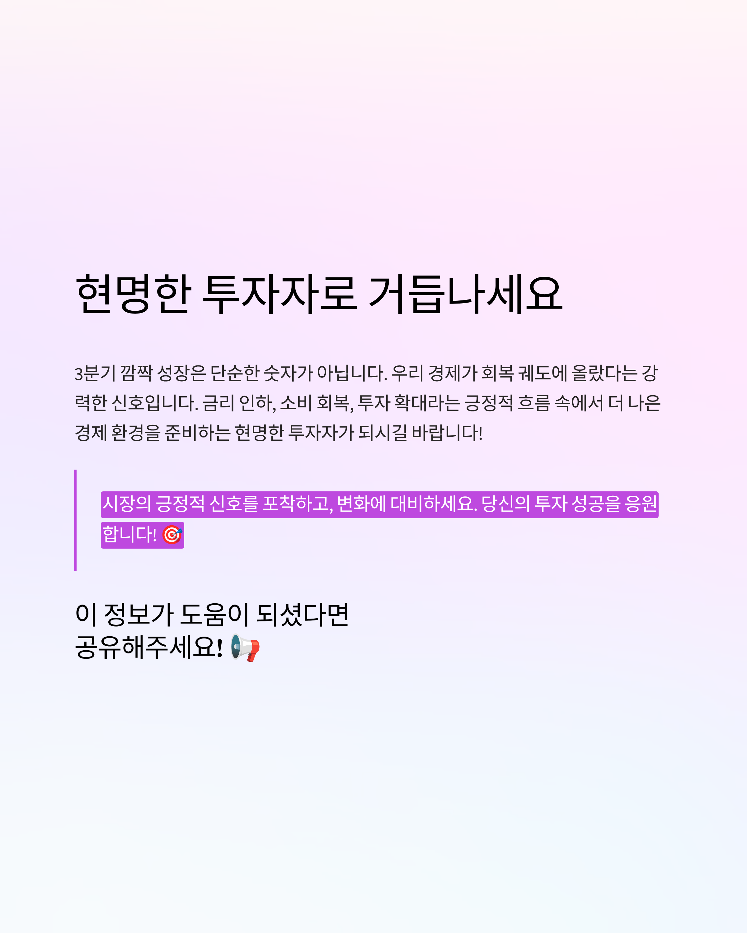 시장의 긍정적인 신호를 놓치지 마시고, 더 나은 경제 환경을 준비하는 현명한 투자자가 되시길 바랍니다!