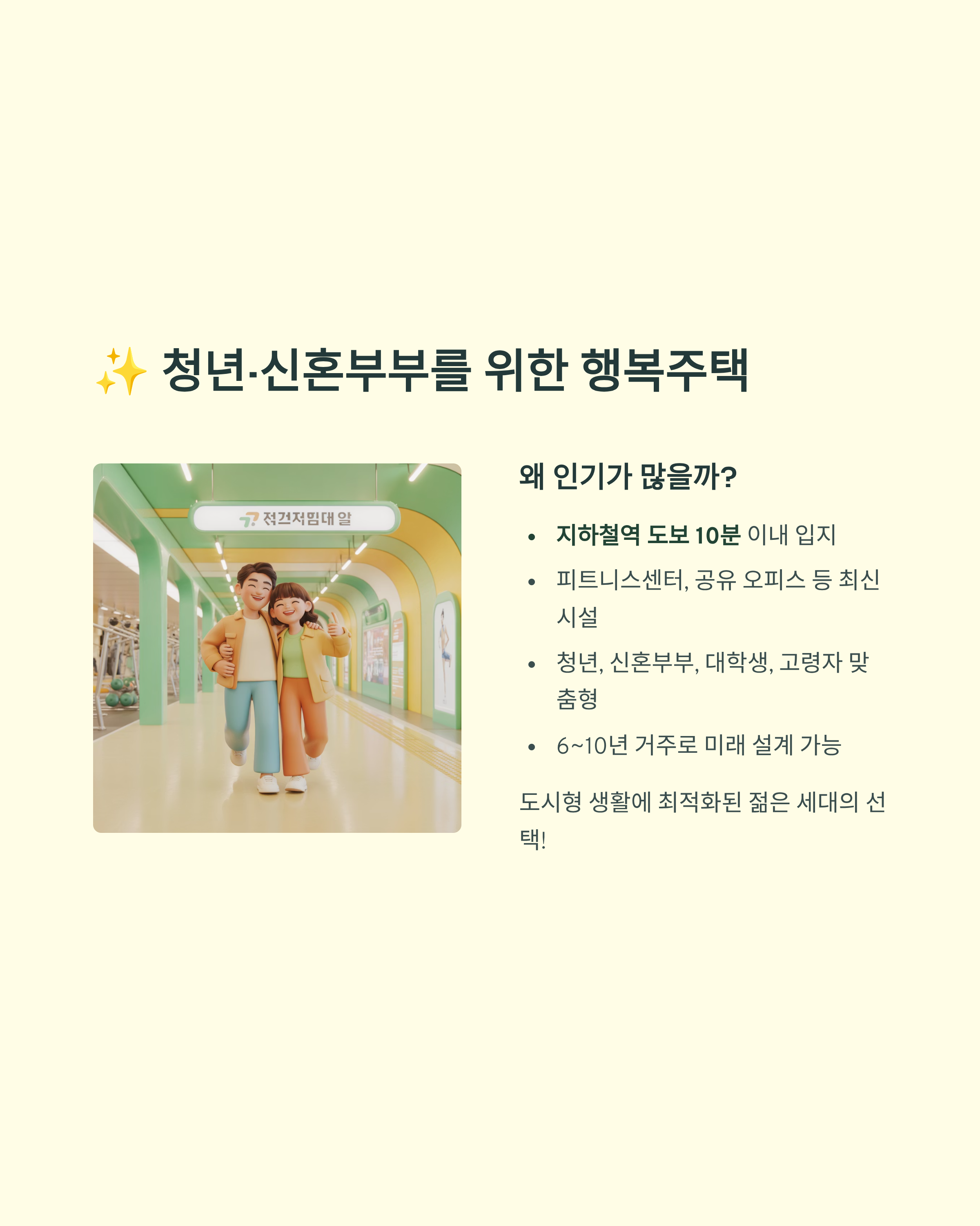 - 대상: 청년, 신혼부부, 사회초년생, 대학생, 고령자 등 미래가 중요한 세대를 위한 도시형 주택입니다.