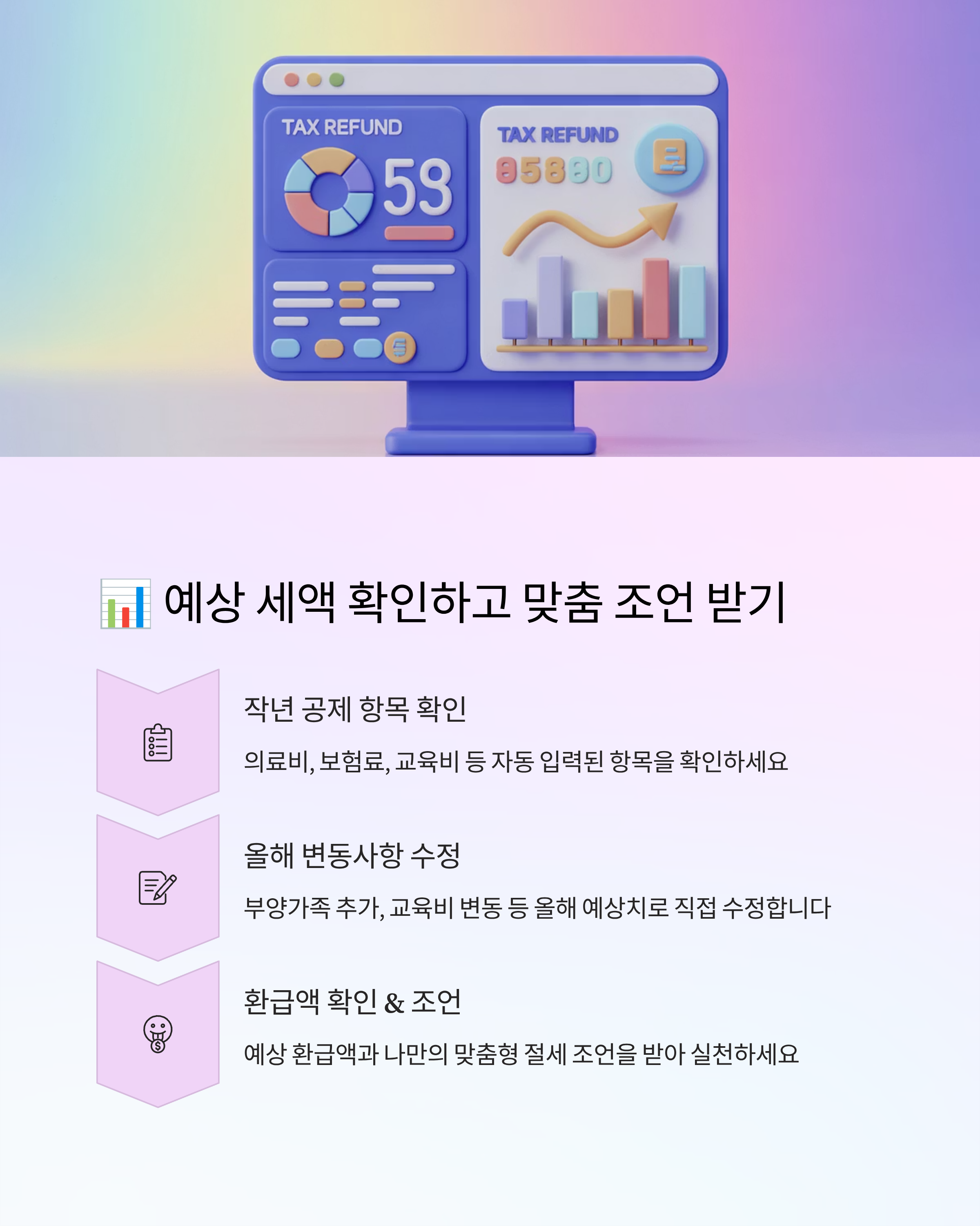 3. 예상 세액 확인: 최종적으로 내년에 환급받을 금액 (혹은 더 내야 할 금액)이 얼마인지 예상해 줍니다.
