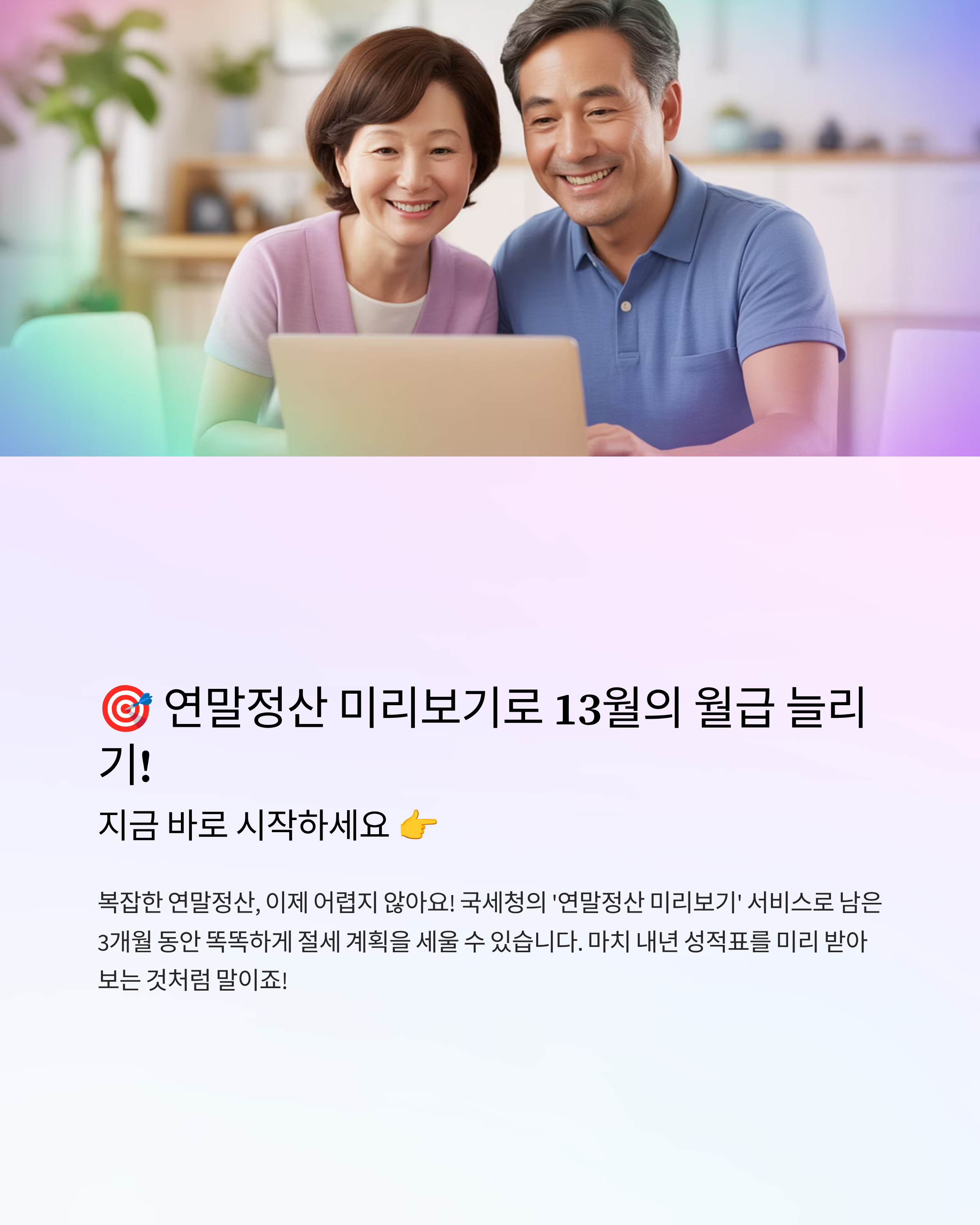 복잡하게만 느껴지는 연말정산, 이제 어렵게 생각하지 마세요! 국세청의 '연말정산 미리보기' 서비스만 잘 활용하면 중장년층도 남은 기간 동안 '13월의 월급'을 늘릴 수 있는 절세 계획을 세울 수 있습니다. 마치 내년 연말정산 성적표를 미리 받아보는 것과 같아요!