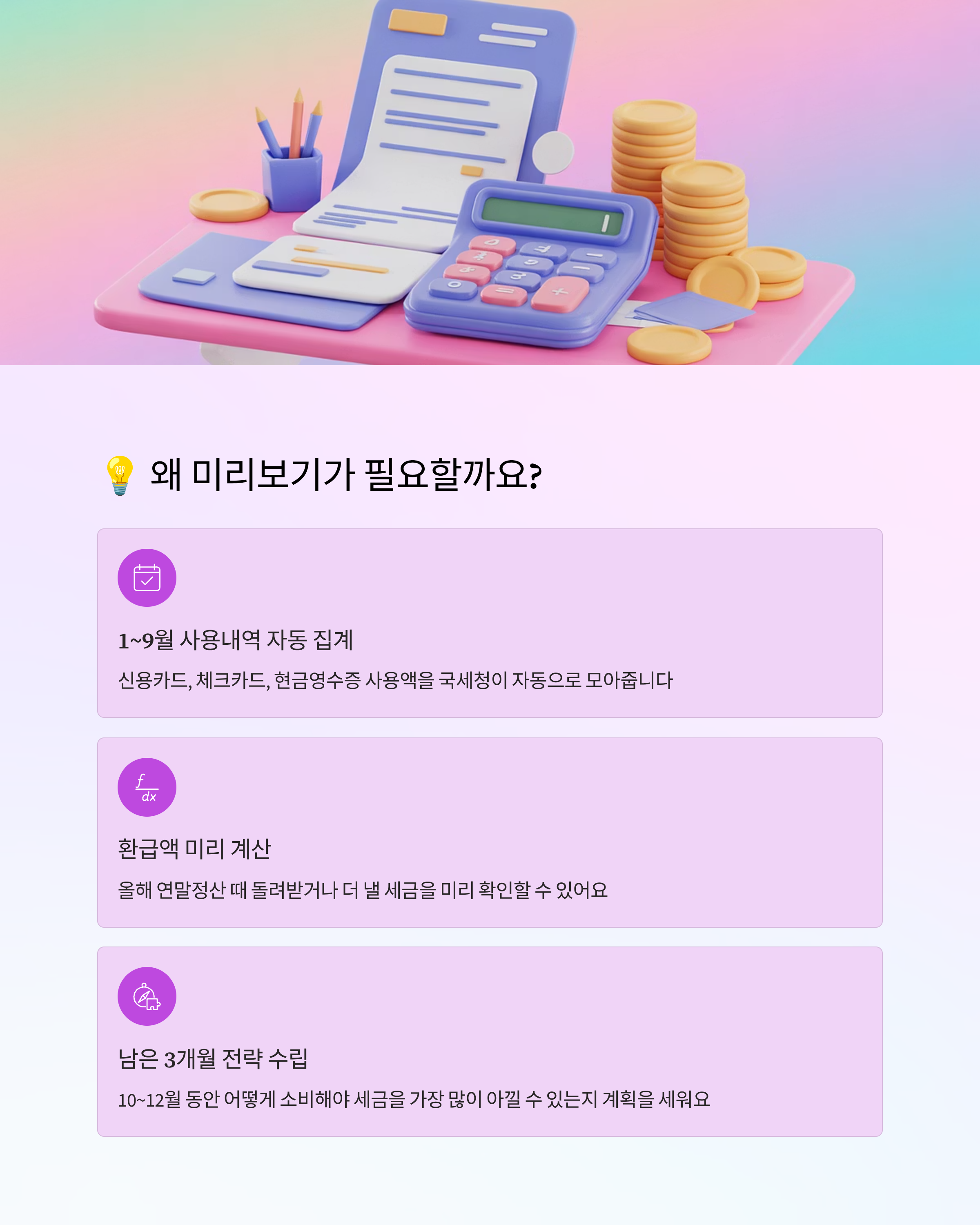 이 서비스는 올해 1월부터 9월까지 내가 쓴 신용카드, 체크카드, 현금 등의 사용액을 국세청이 미리 모아줍니다. 그리고 이 정보를 바탕으로 **올해 연말정산 때 얼마의 세금을 돌려받거나(환급) 더 내야 할지(납부)**를 미리 계산해 주는 서비스예요.