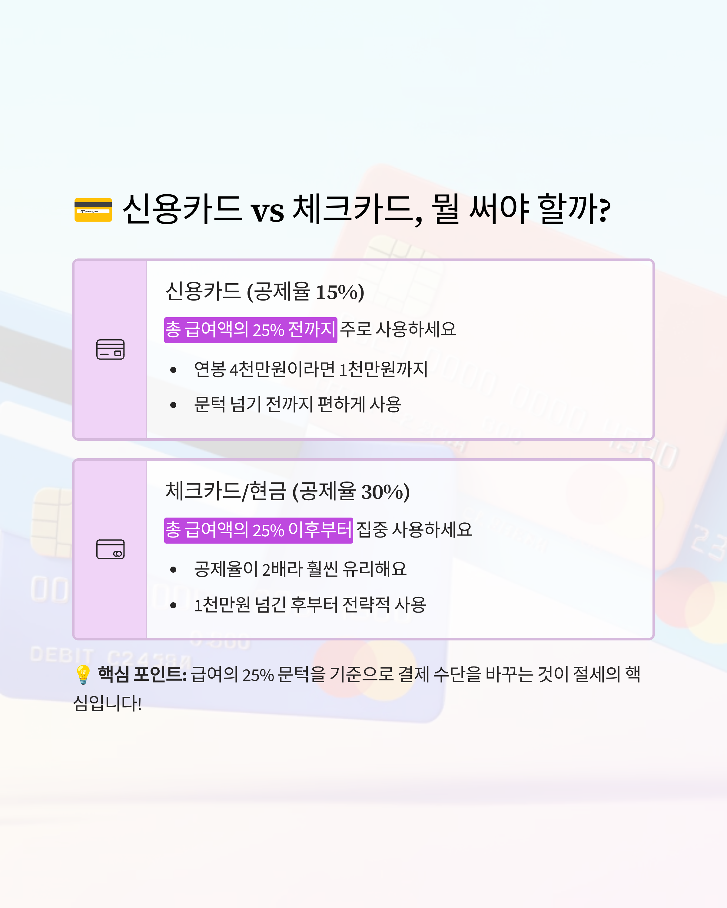 💡 쉽게 이해하기: 만약 연봉이 4천만 원이라면, 1천만 원(4천만 원의 25%)까지는 신용카드로 사용해도 괜찮습니다. 1천만 원을 넘긴 후부터는 공제율이 2배인 체크카드나 현금영수증을 집중적으로 쓰는 것이 절세에 훨씬 유리합니다!