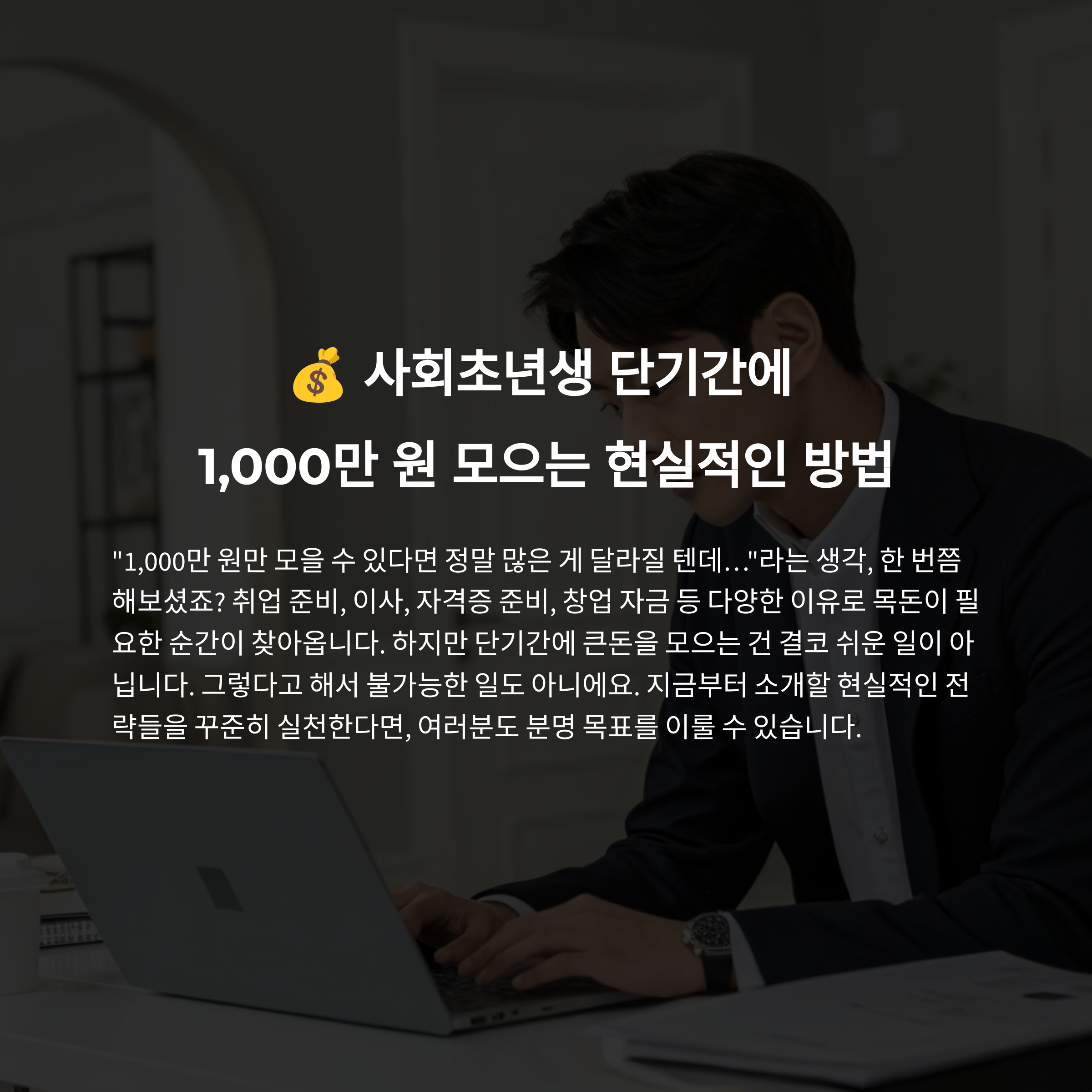 “1,000만 원만 모을 수 있다면 정말 많은 게 달라질 텐데…”라는 생각, 한 번쯤 해보셨죠? 취업 준비, 이사, 자격증 준비, 창업 자금 등 다양한 이유로 목돈이 필요한 순간이 찾아옵니다. 하지만 단기간에 큰돈을 모으는 건 결코 쉬운 일이 아닙니다. 그렇다고 해서 불가능한 일도 아니에요. 지금부터 소개할 현실적인 전략들을 꾸준히 실천한다면, 여러분도 분명 목표를 이룰 수 있습니다.