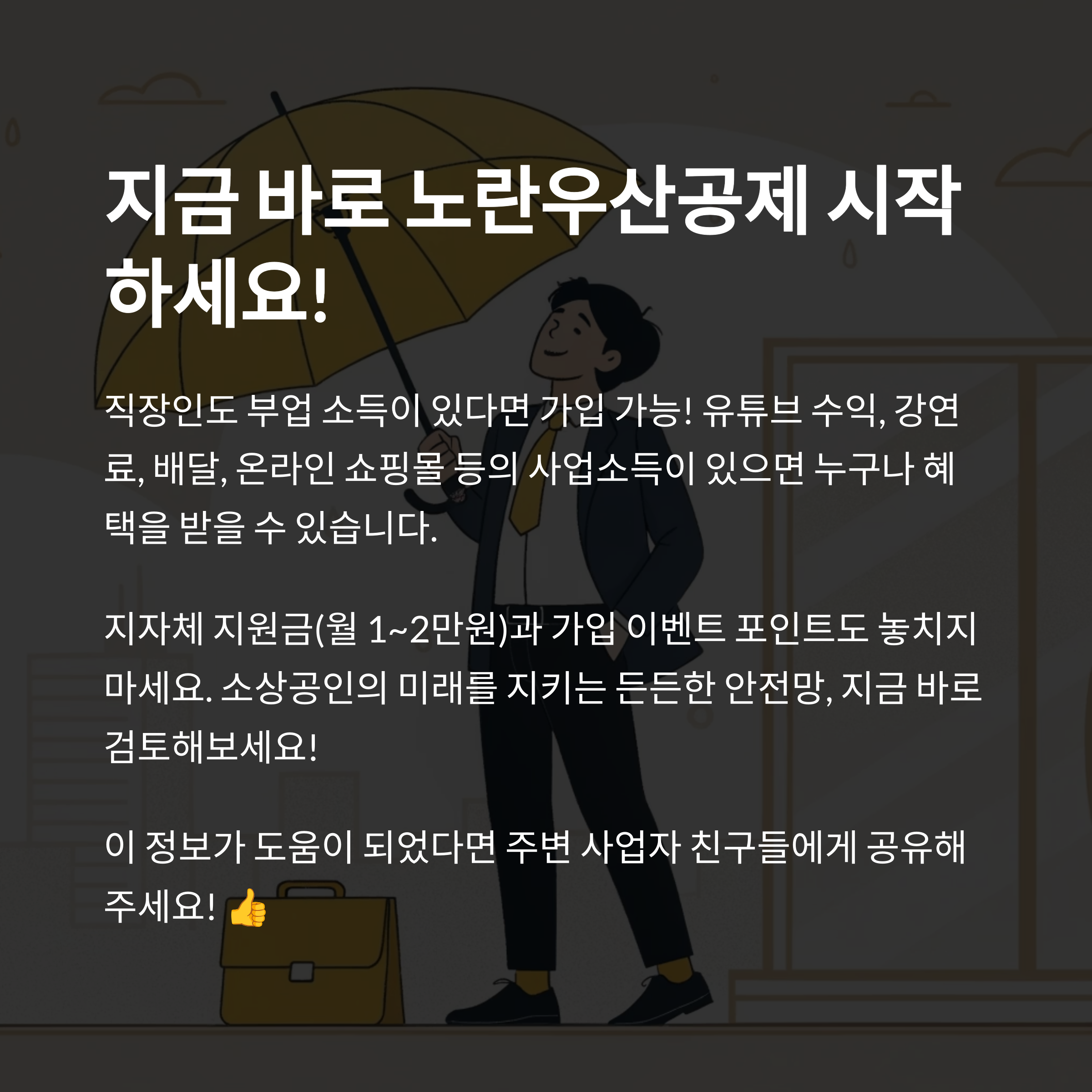 즉, 4대 보험 가입자라도 부업이 있다면 노란우산공제를 활용할 수 있다는 뜻이죠.