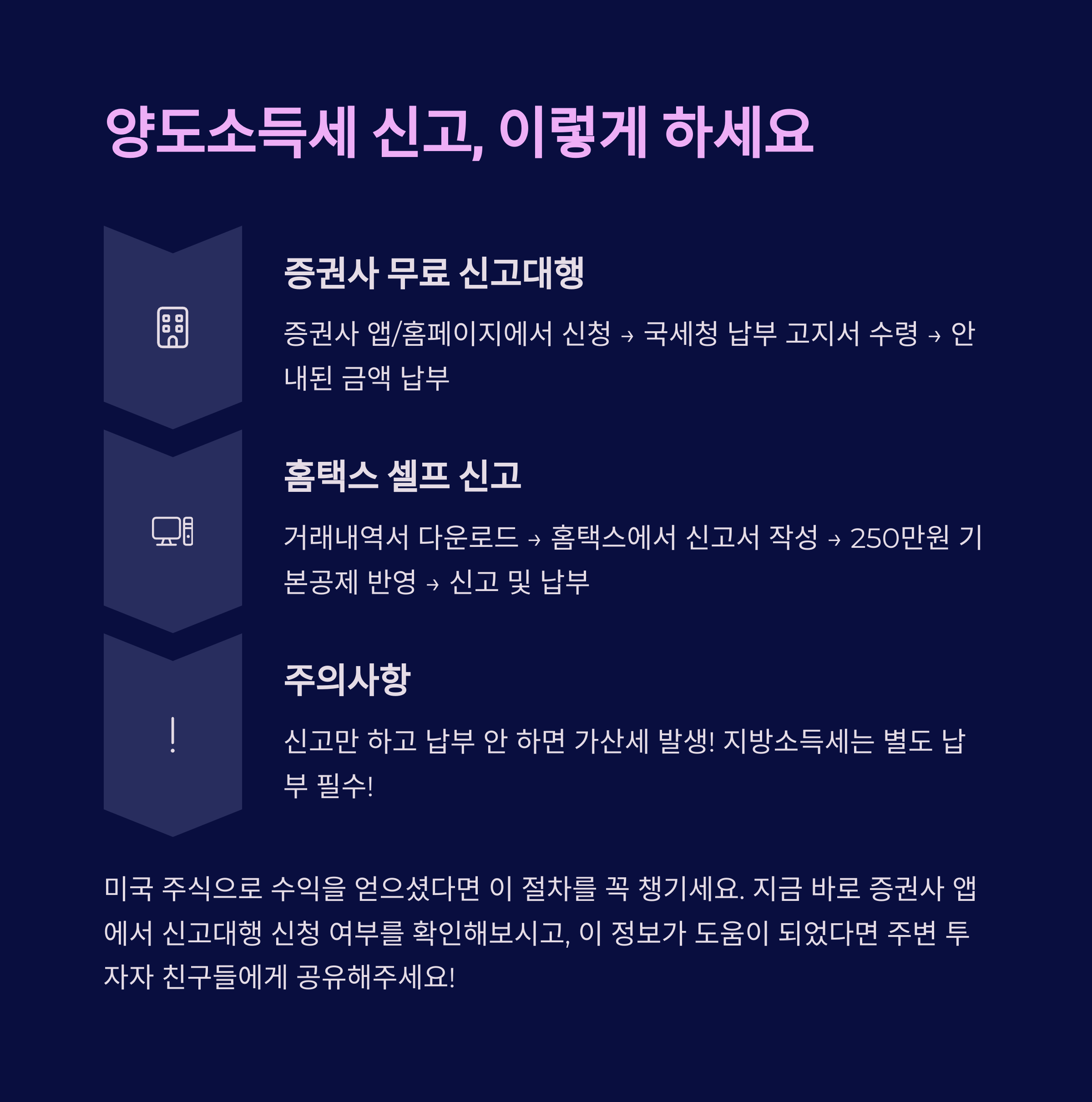 - 증권사 신고대행 또는 홈택스 셀프신고 가능