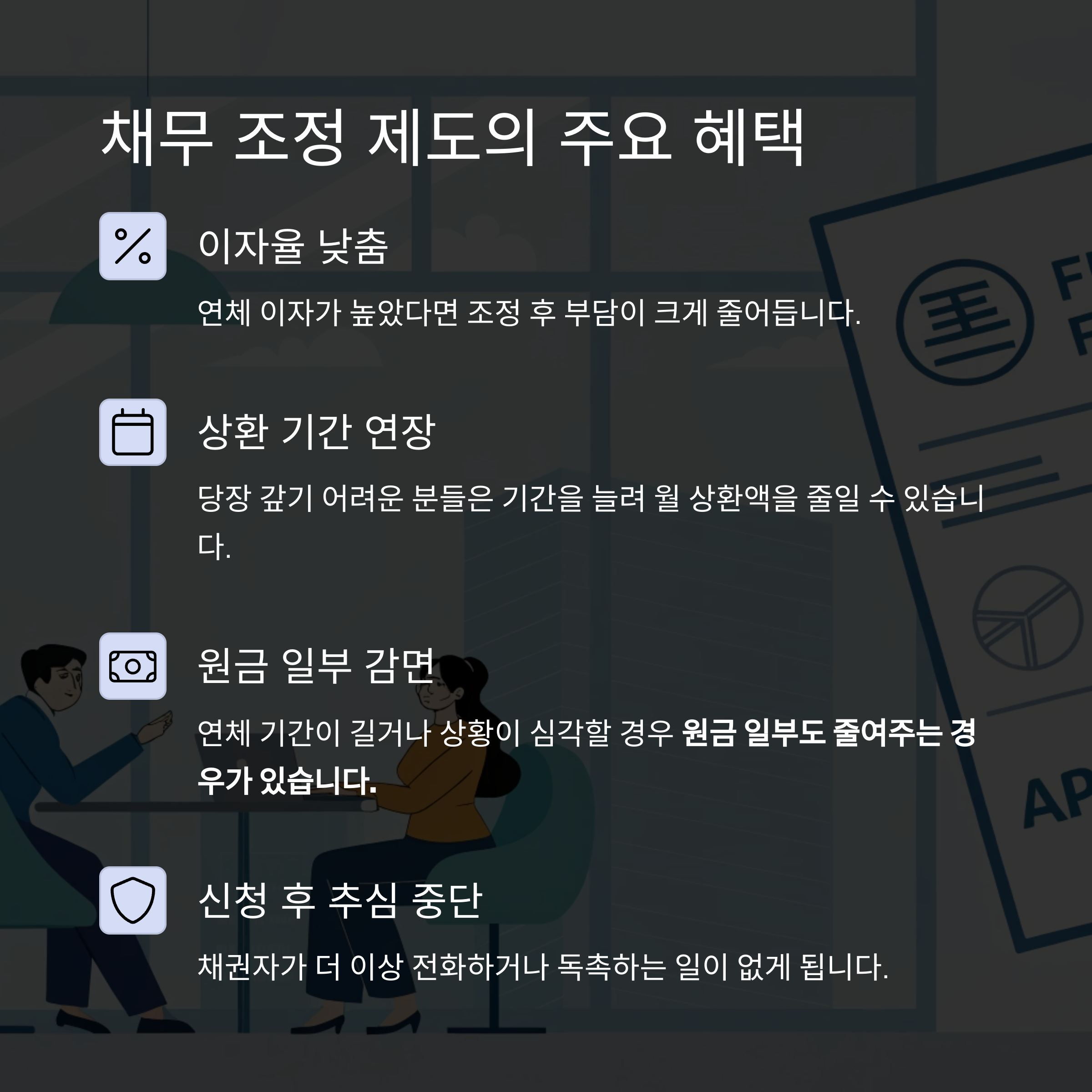 - 원금 일부 감면: 연체 기간이 길거나 상황이 심각할 경우 원금 일부도 줄여주는 경우가 있습니다.