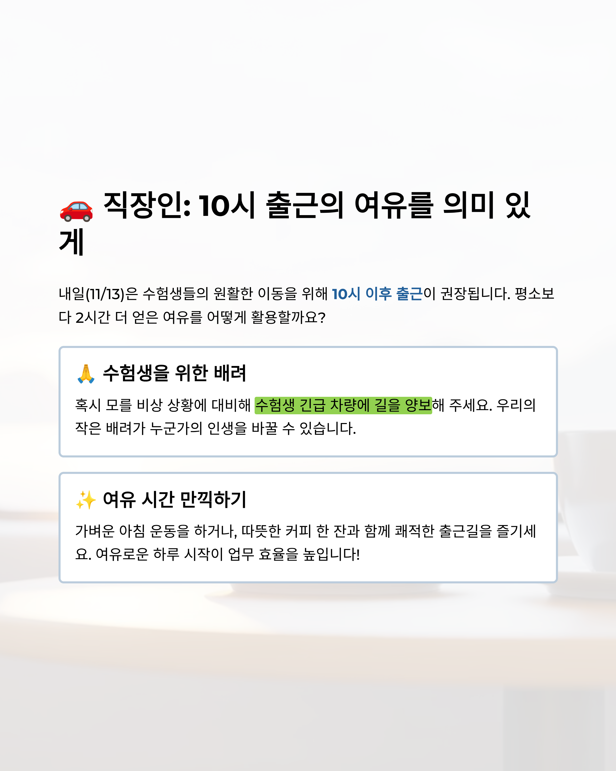 내일(11/13)은 수험생들의 원활한 이동을 위해 10시 이후 출근이 권장됩니다.