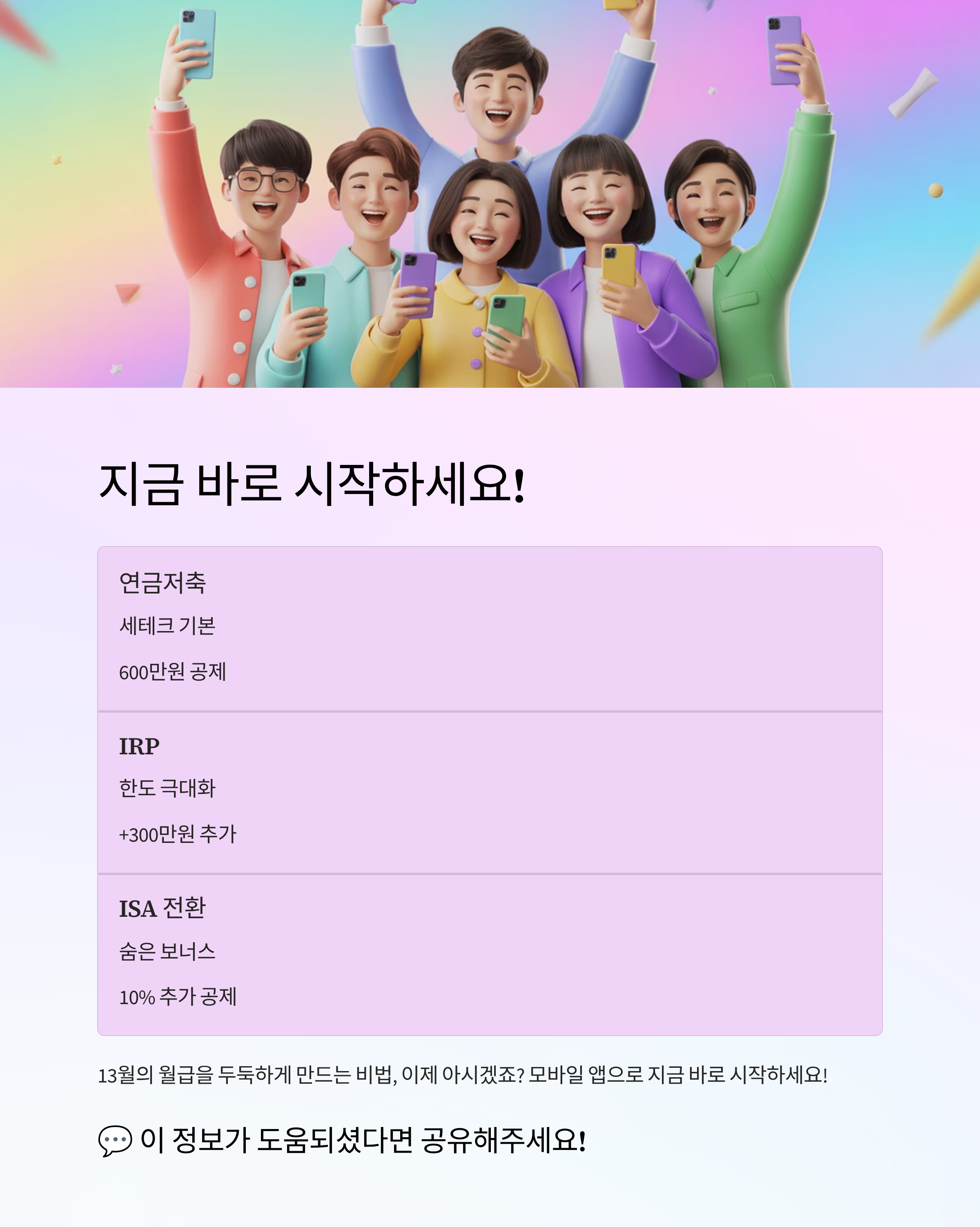 • 추가 세액공제: ISA 만기 자금을 연금계좌로 전환할 때, **전환 금액의 10%**를 추가로 세액공제 해줍니다.