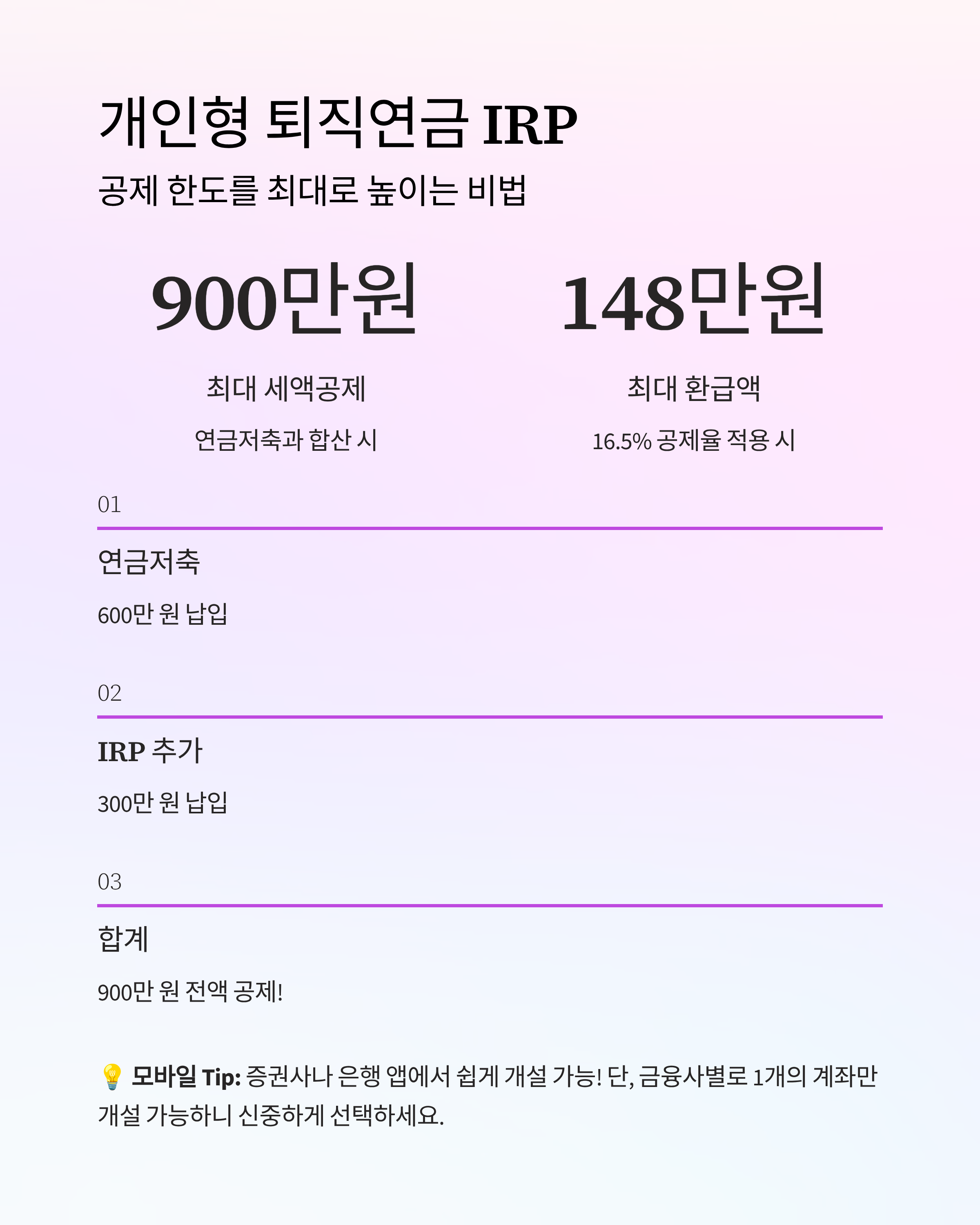 • 쉬운 이해: IRP에 추가로 300만 원을 더 넣으면, 최대 900만 원에 대한 세금 혜택을 받아 **최대 148만 5천 원(900만원 × 16.5%)**까지 세금을 아낄 수 있습니다.