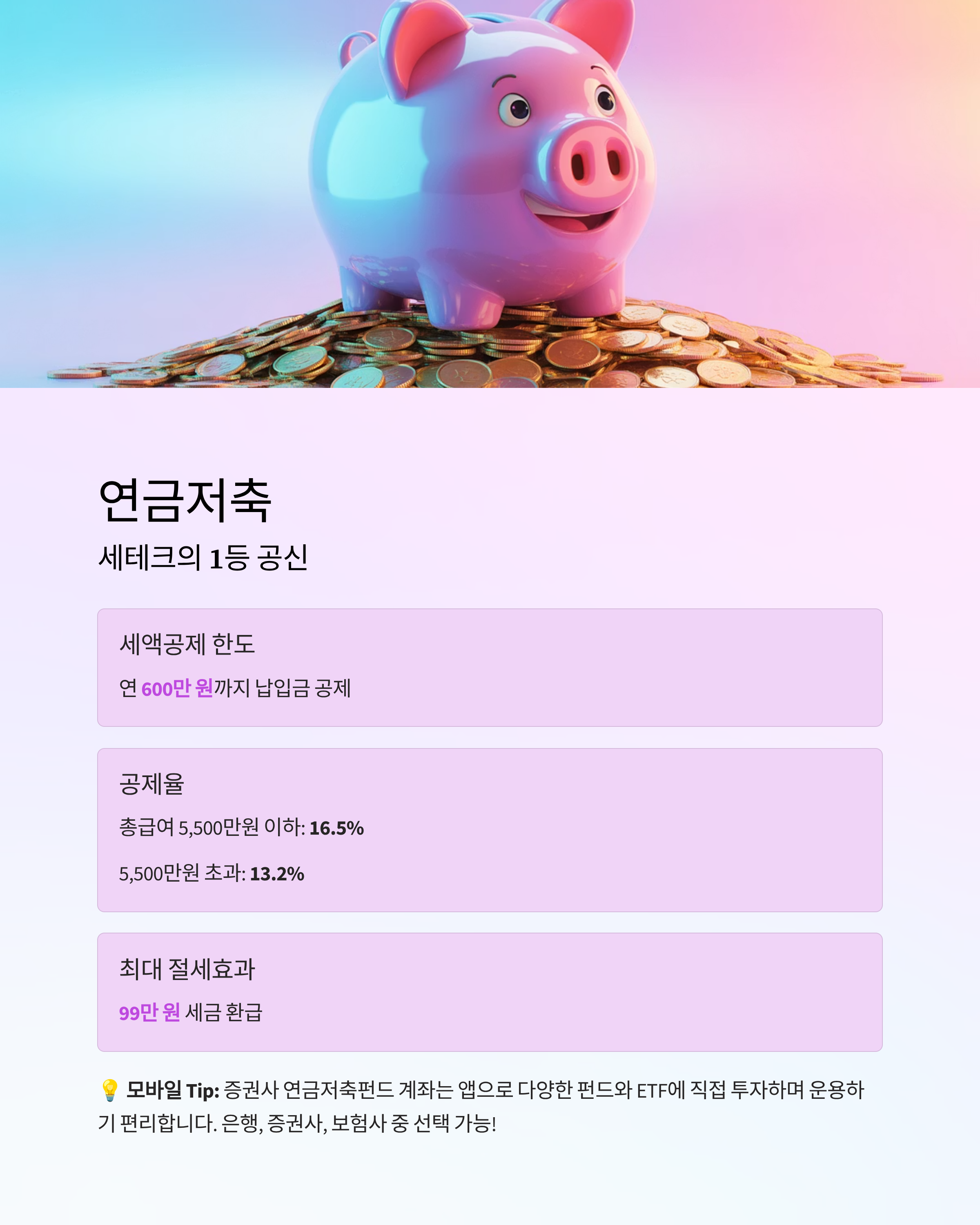 노후 대비는 물론, 매년 세금 혜택까지 챙겨주는 세테크(세금+재테크)의 1등 공신입니다.