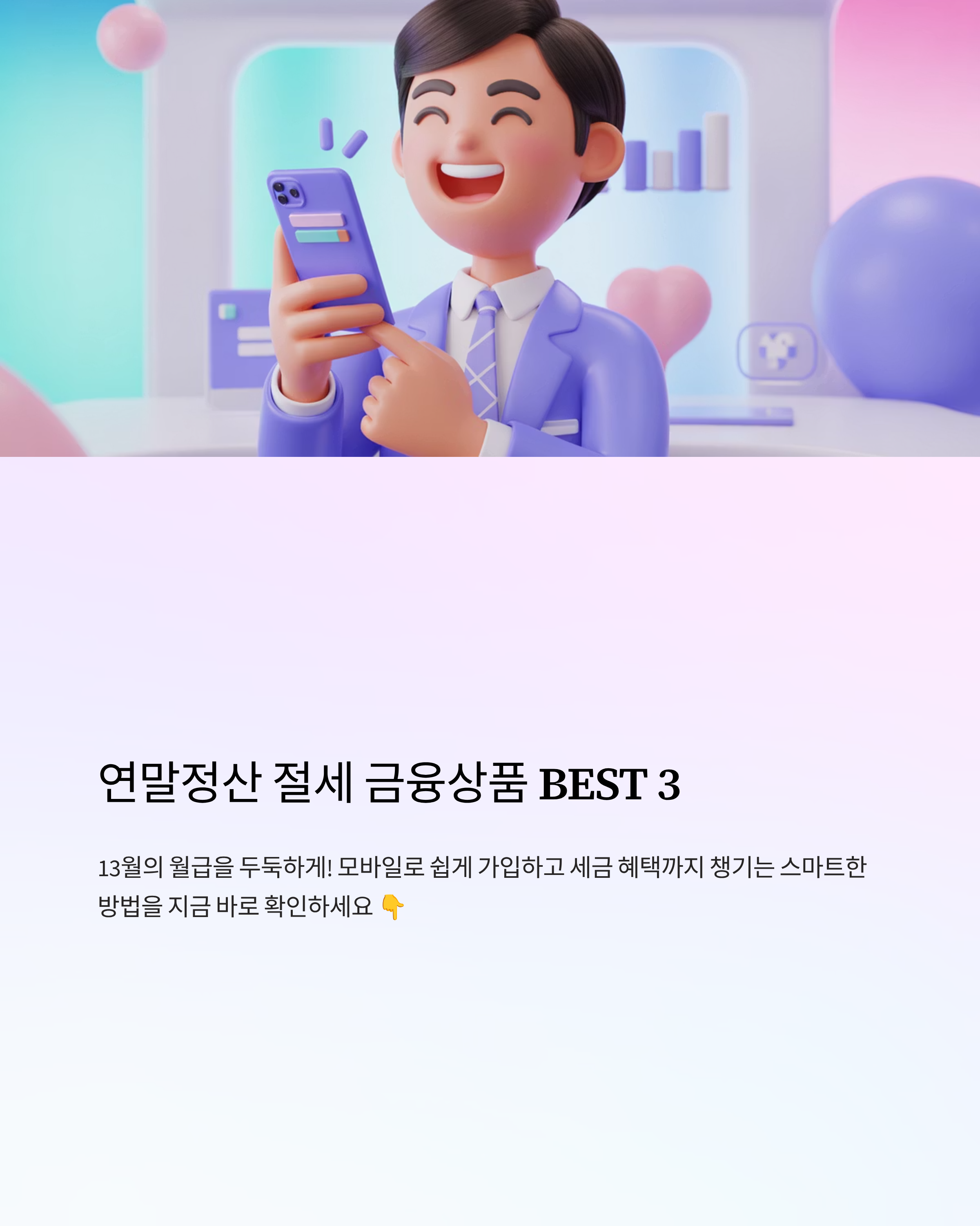 지금부터 모바일로 쉽게 가입하고 관리할 수 있는 연말정산 세액공제 금융상품 3가지를 핵심만 쏙쏙 뽑아 알려드릴게요! 👇