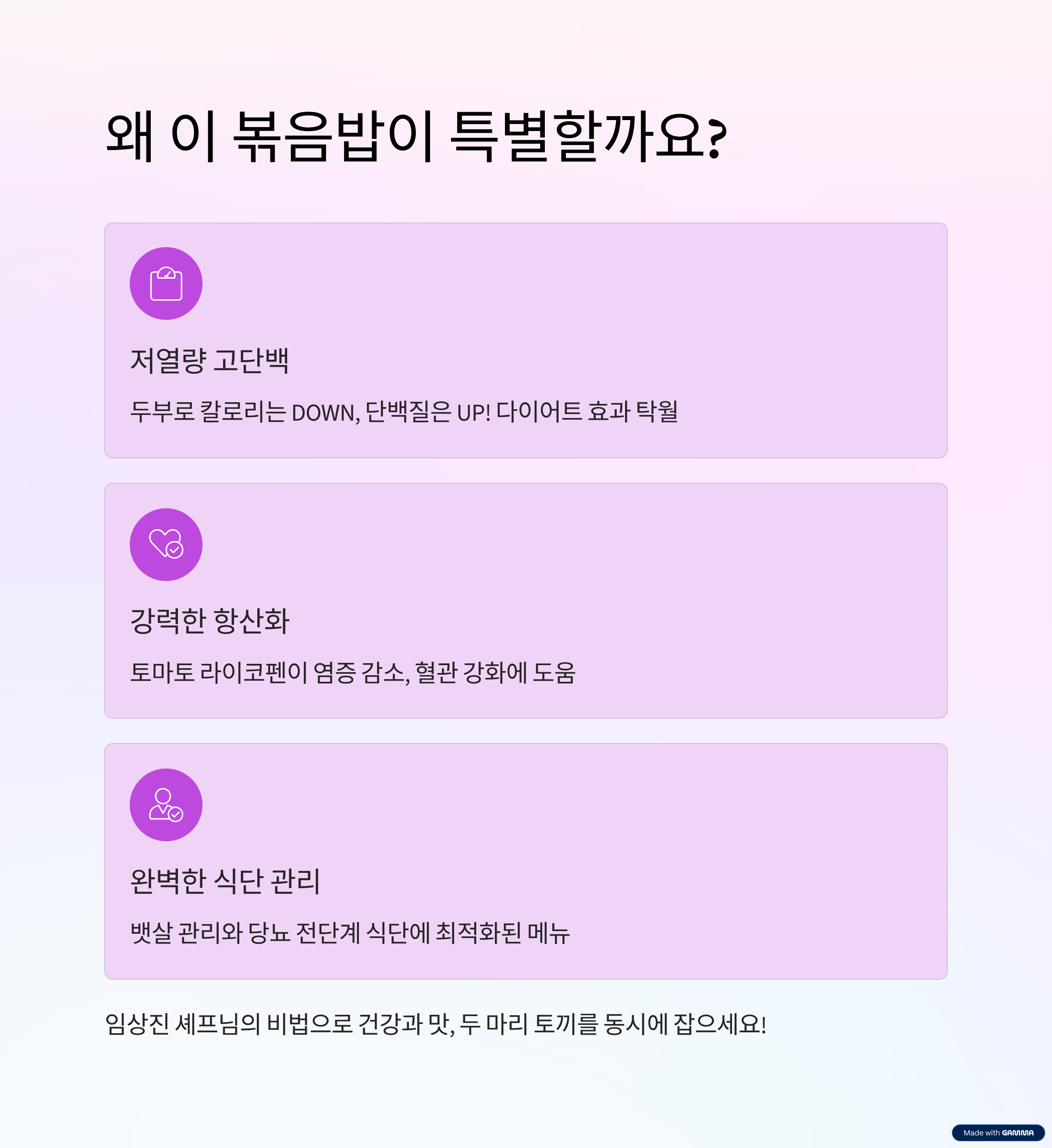 - 저열량 & 고단백: 밥 대신 두부로 칼로리 DOWN, 단백질 UP! 다이어트 효과가 탁월합니다.