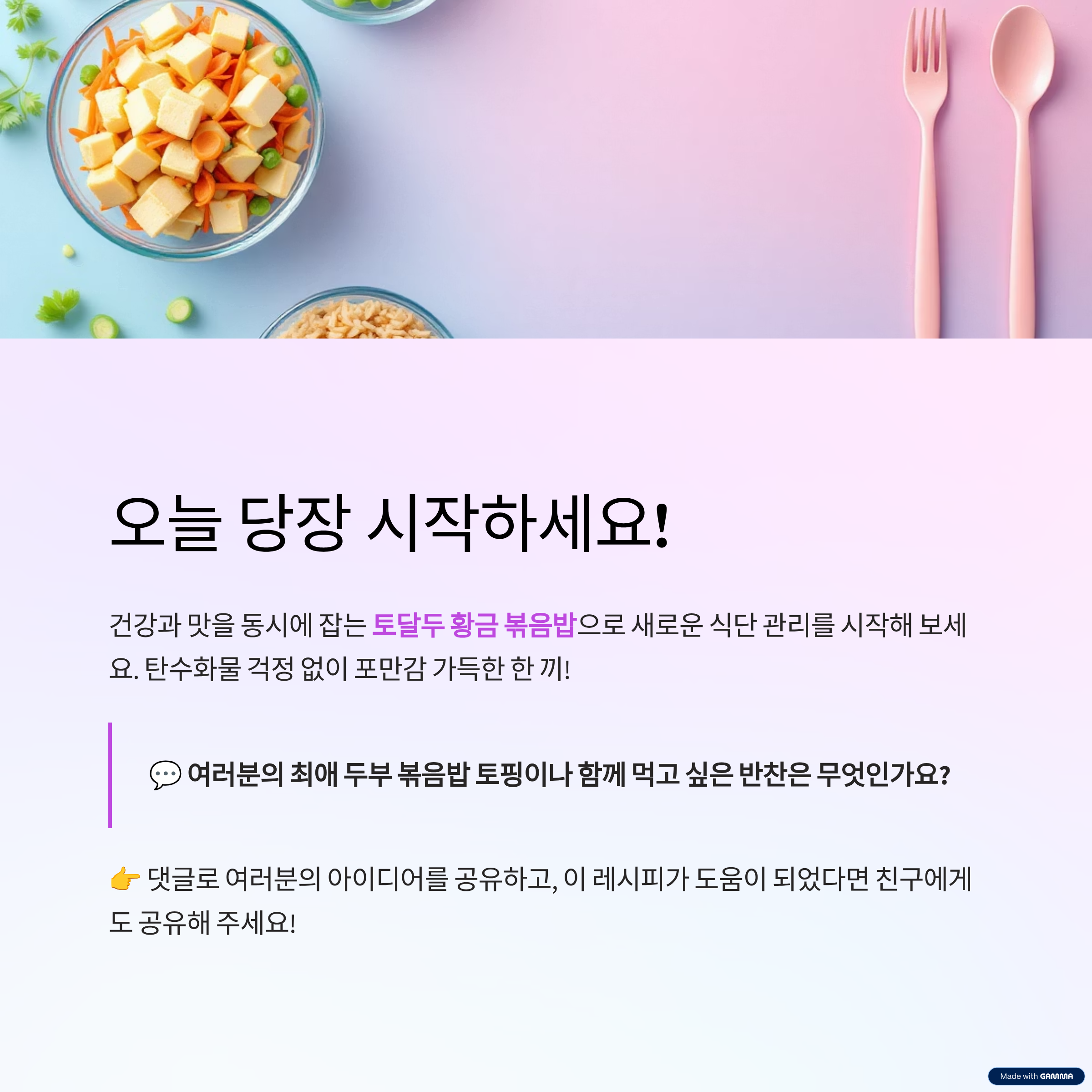 여러분의 최애 '두부 볶음밥' 토핑이나 함께 먹고 싶은 반찬은 무엇인가요? 댓글로 알려주세요!
