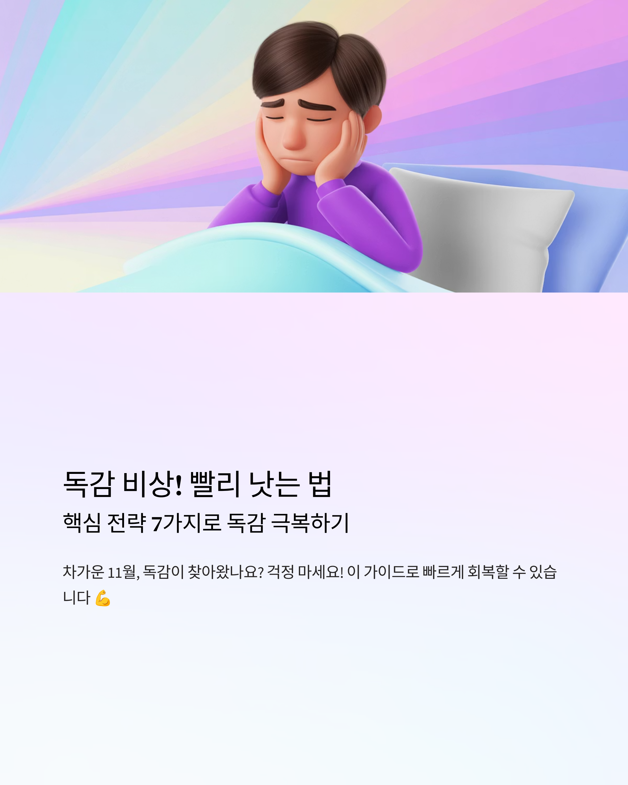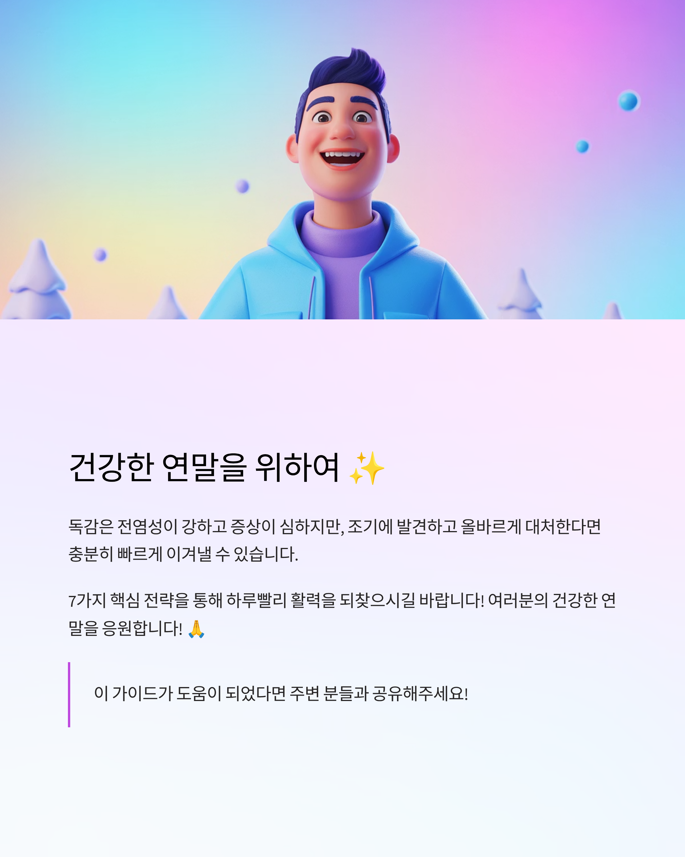 이 11월 말, 독감으로 힘든 시간을 보내고 계신 모든 분들이 7가지 핵심 전략을 통해 하루빨리 활력을 되찾으시길 바랍니다! 여러분의 건강한 연말을 응원합니다! 🙏