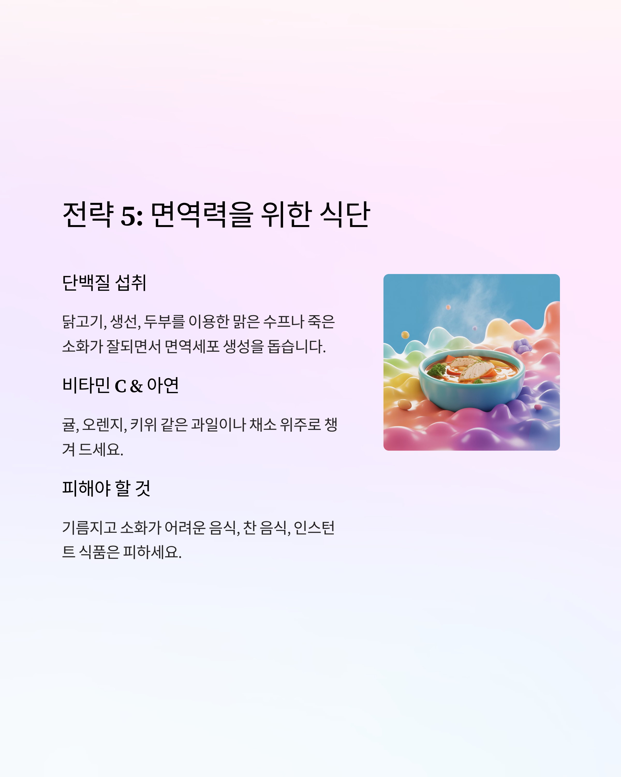 - 피해야 할 것: 기름지고 소화가 어려운 음식, 찬 음식, 인스턴트 식품은 장에 부담을 주어 면역 활동을 방해할 수 있습니다.