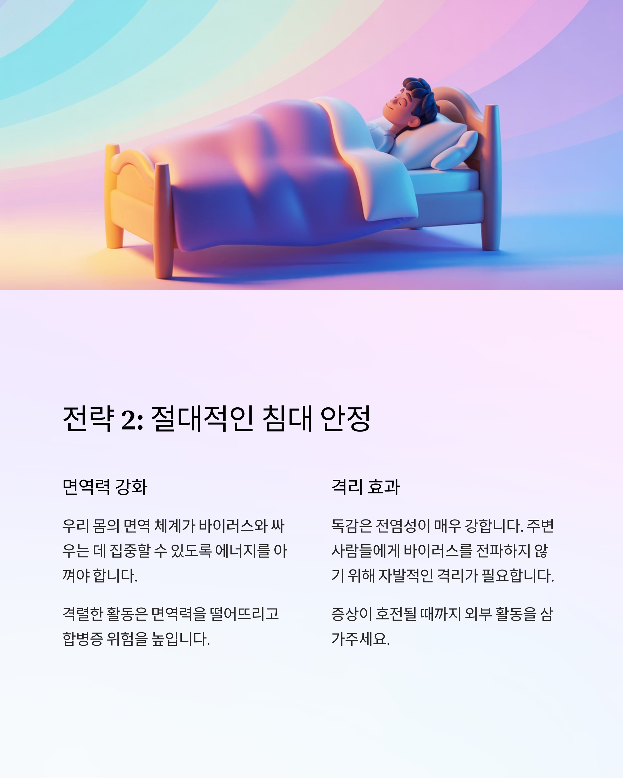 - 면역력 강화: 우리 몸의 면역 체계가 바이러스와 싸우는 데 집중할 수 있도록 에너지를 아껴야 합니다. 격렬한 활동은 면역력을 떨어뜨리고 합병증 위험을 높입니다.