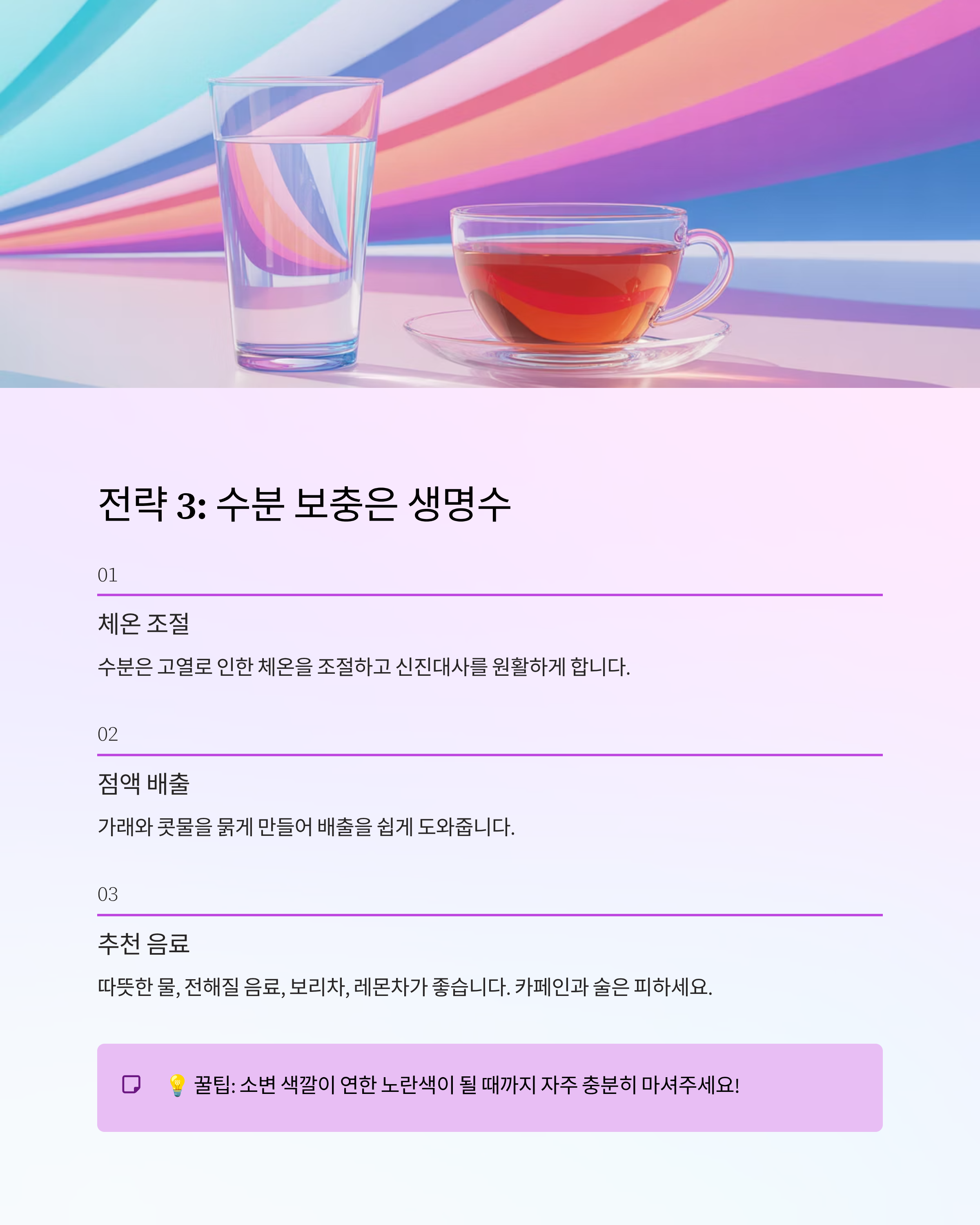 💡 꿀팁: 소변 색깔이 연한 노란색이 될 때까지 자주, 충분히 마셔주세요!