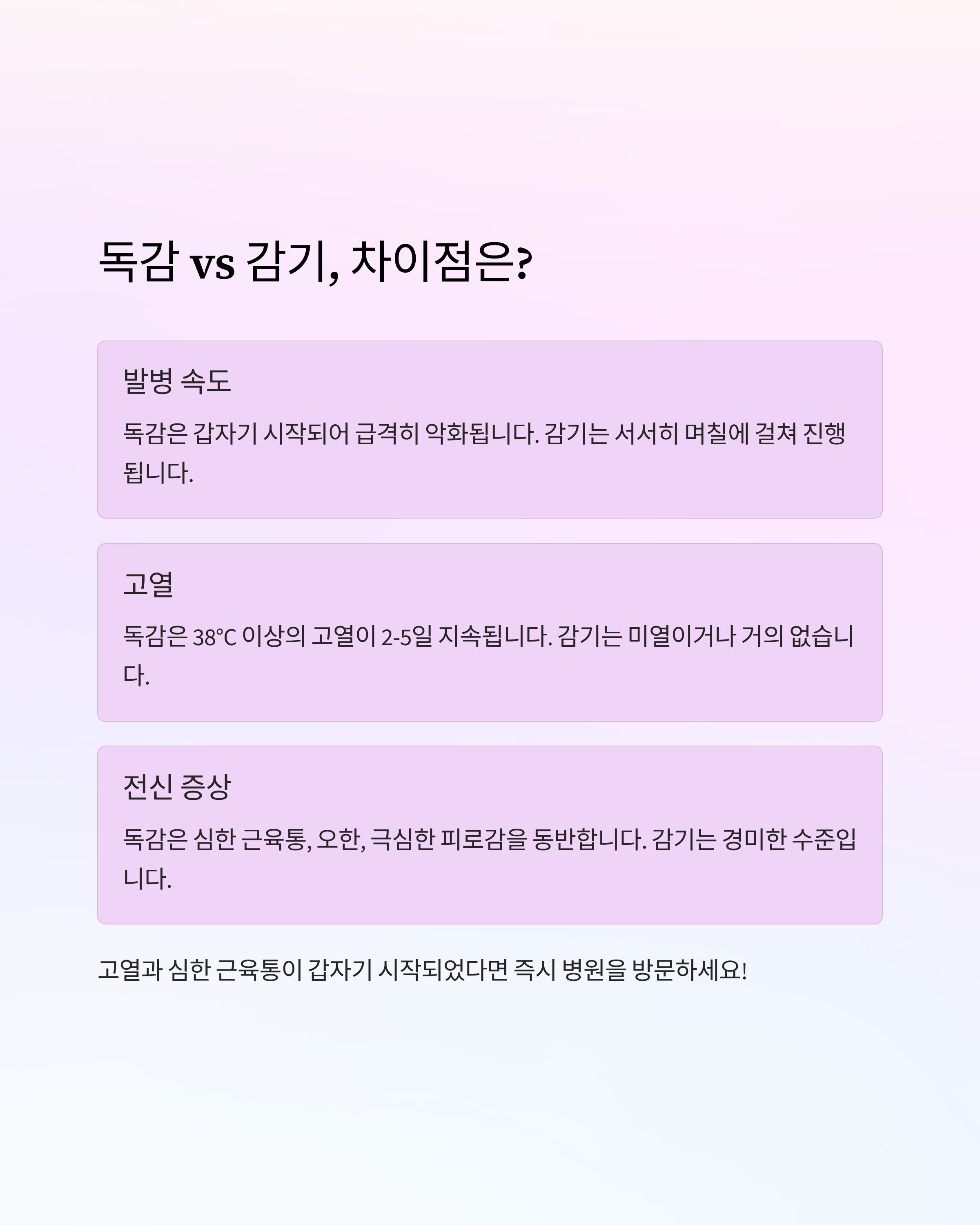만약 고열과 심한 근육통이 갑자기 시작되었다면, 곧바로 병원을 방문하여 독감 검사를 받아보시는 것이 중요합니다!