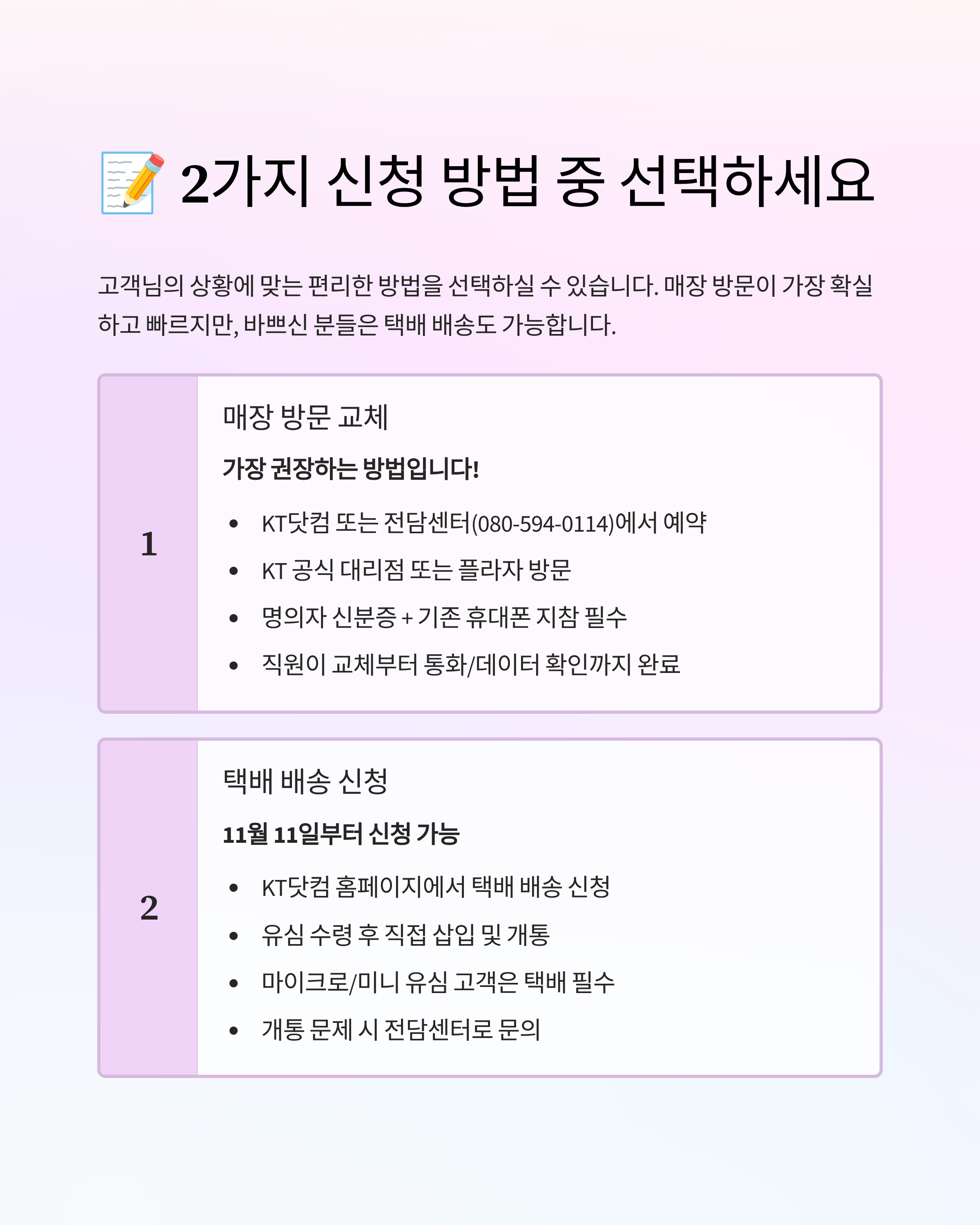 💡 주의: KT 망을 사용하는 알뜰폰 고객도 대상이지만, 구체적인 교체 일정과 방법은 이용하고 계신 알뜰폰 사업자를 통해 별도로 안내될 예정이니 해당 사업자에게 꼭 문의해 주세요.