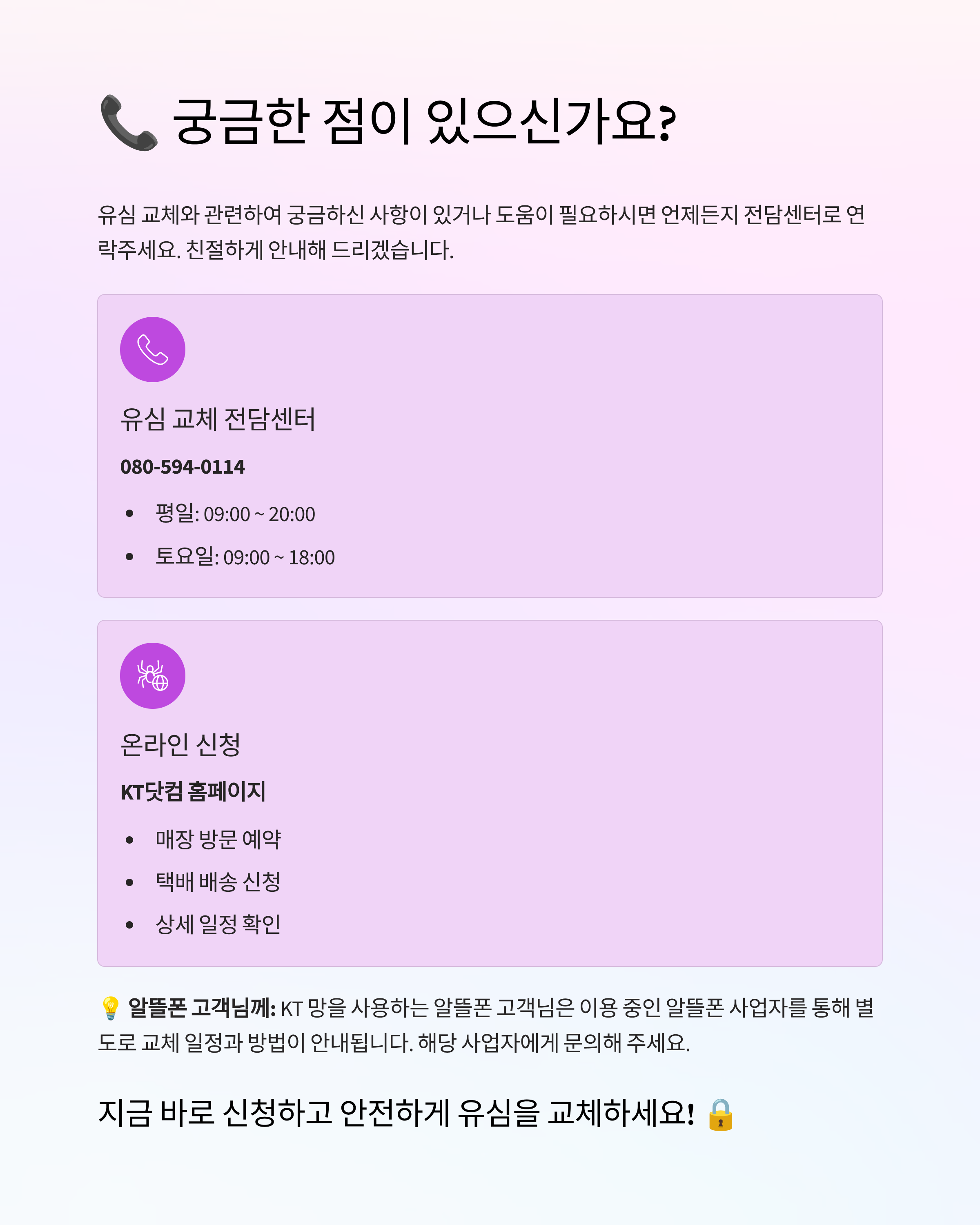 KT 고객님의 보안 강화와 불안 해소를 위한 유심(USIM) 무상 교체가 진행됩니다. 누가 대상이고, 어떻게 신청해야 하는지, 그리고 언제부터 교체가 가능한지 자세히 안내해 드릴게요.