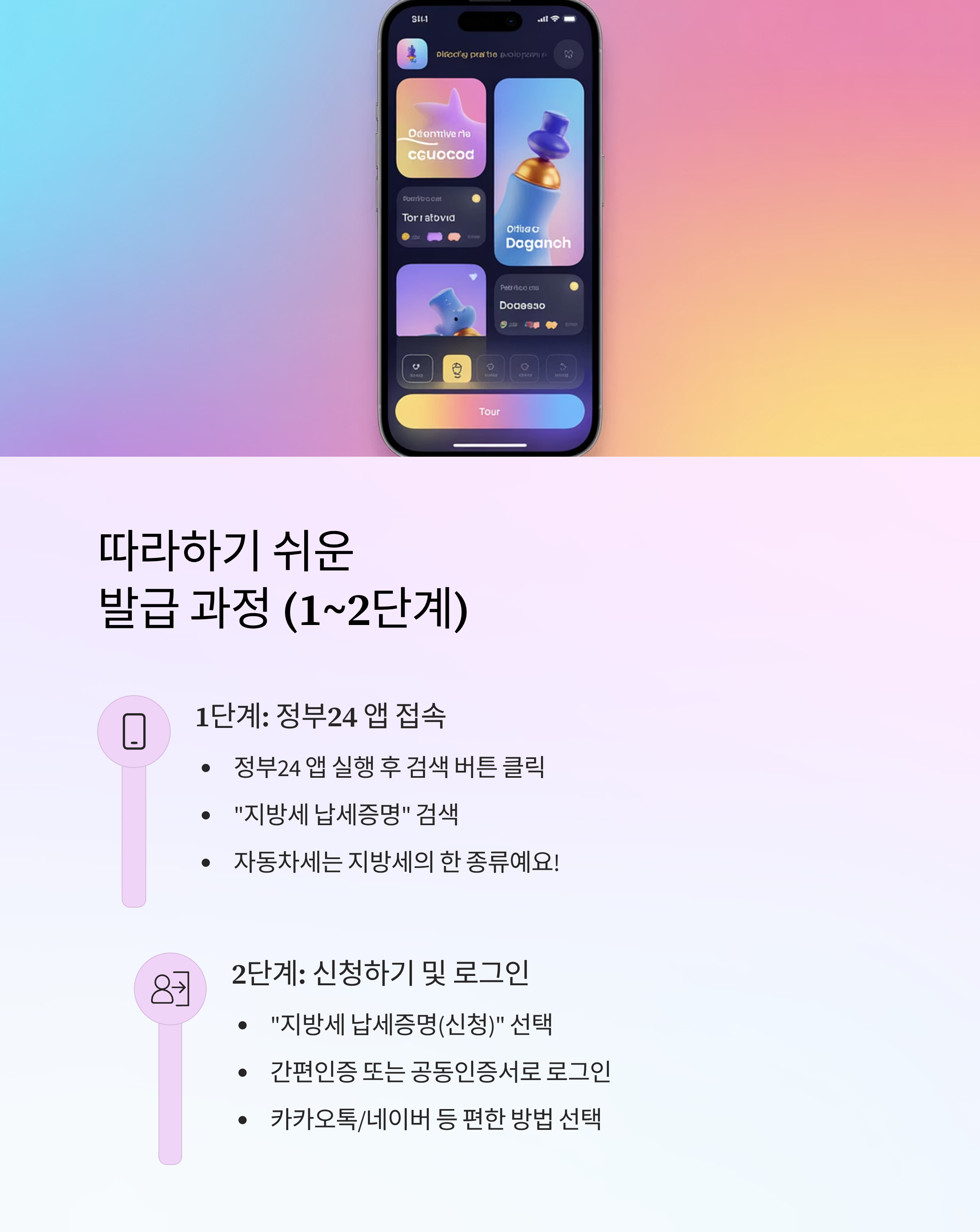지방세인 자동차세 완납증명서는 '정부24' 앱이나 웹사이트에서 쉽게 발급받을 수 있답니다. 천천히 따라오세요!