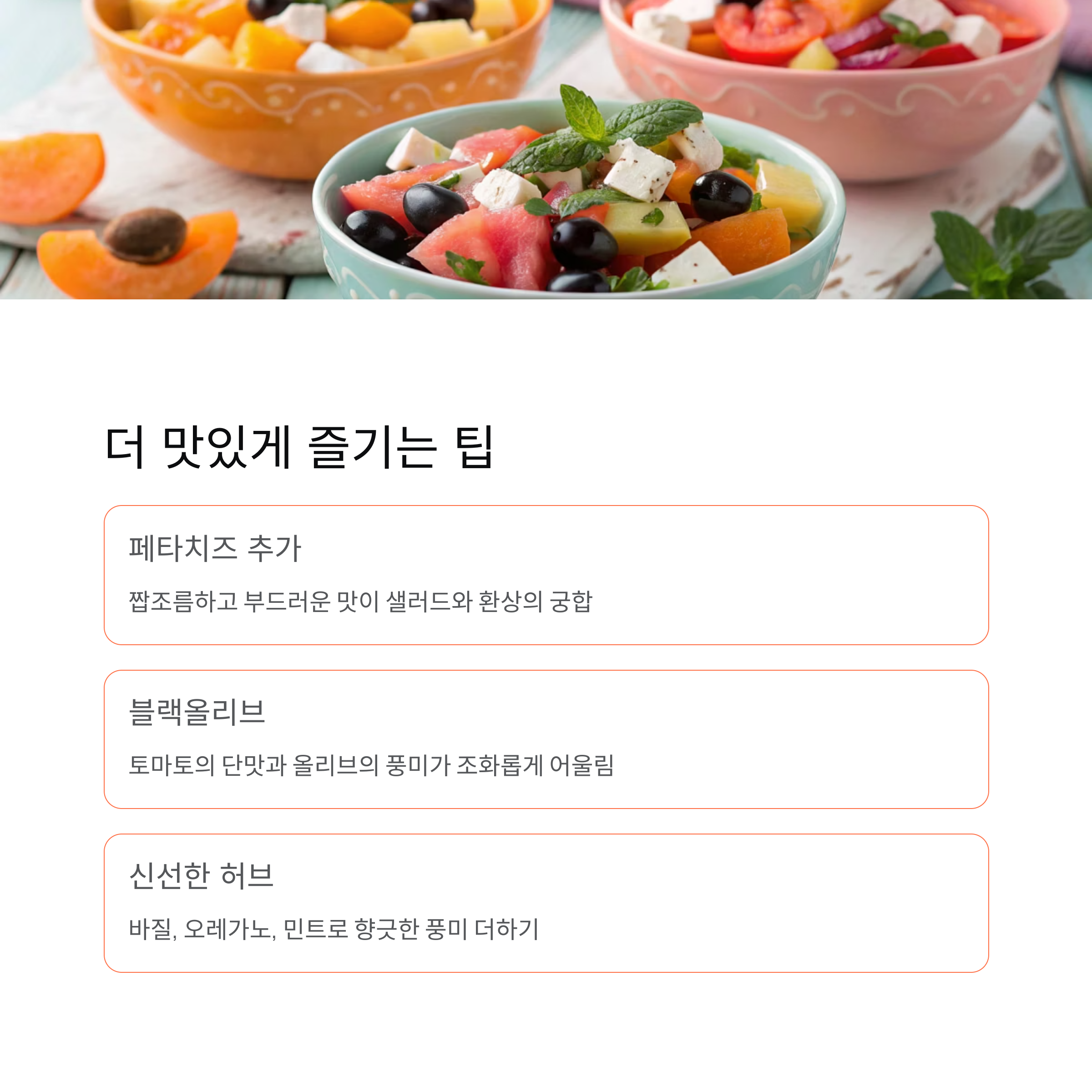 - 페타치즈: 짭조름하고 부드러운 맛이 더해져 궁합 최고!