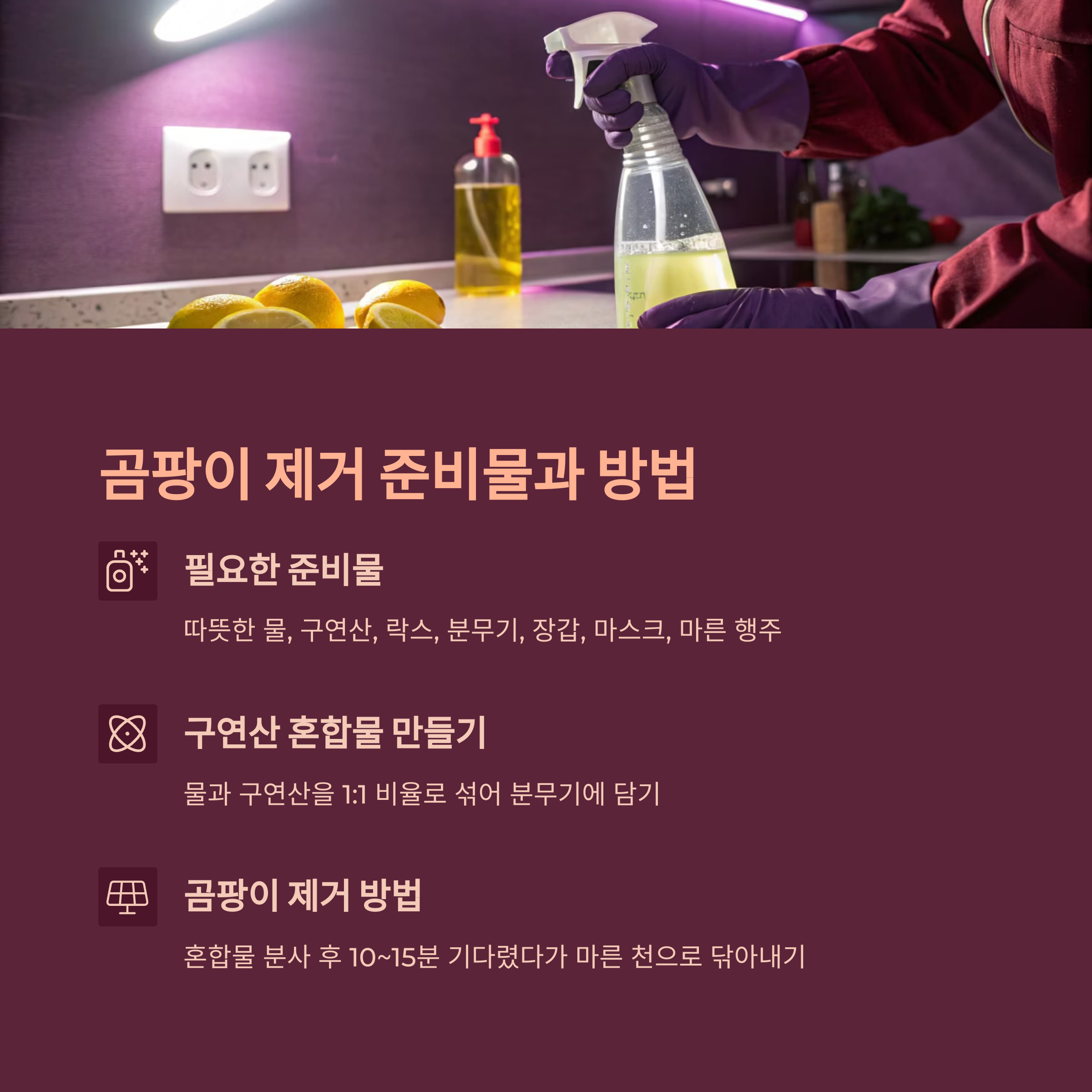 전문 업체를 부르지 않고도, 집에 있는 재료로 곰팡이를 깨끗하게 제거할 수 있는 방법이 있습니다. 지금부터 중장년도 쉽게 따라할 수 있는 곰팡이 제거 방법을 단계별로 알려드릴게요.