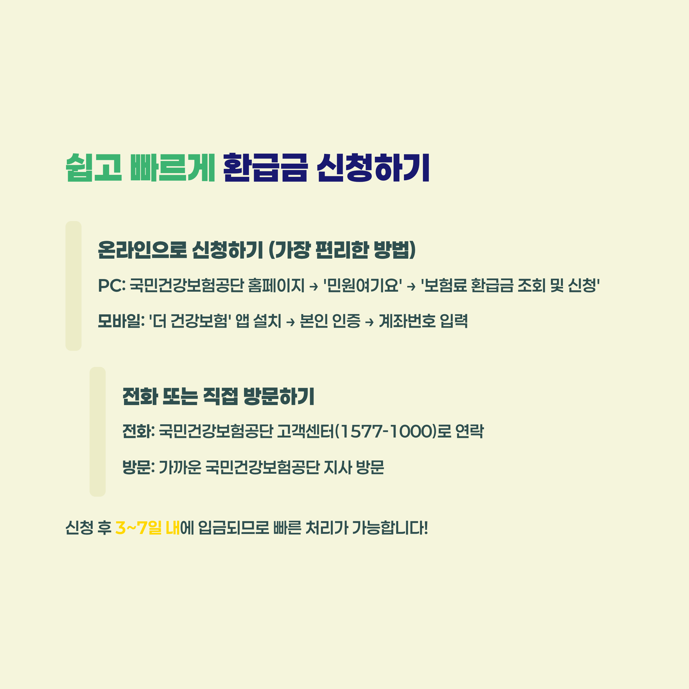 - 전화: 국민건강보험공단 고객센터에 전화하여 환급금을 조회하고 신청할 수 있습니다.