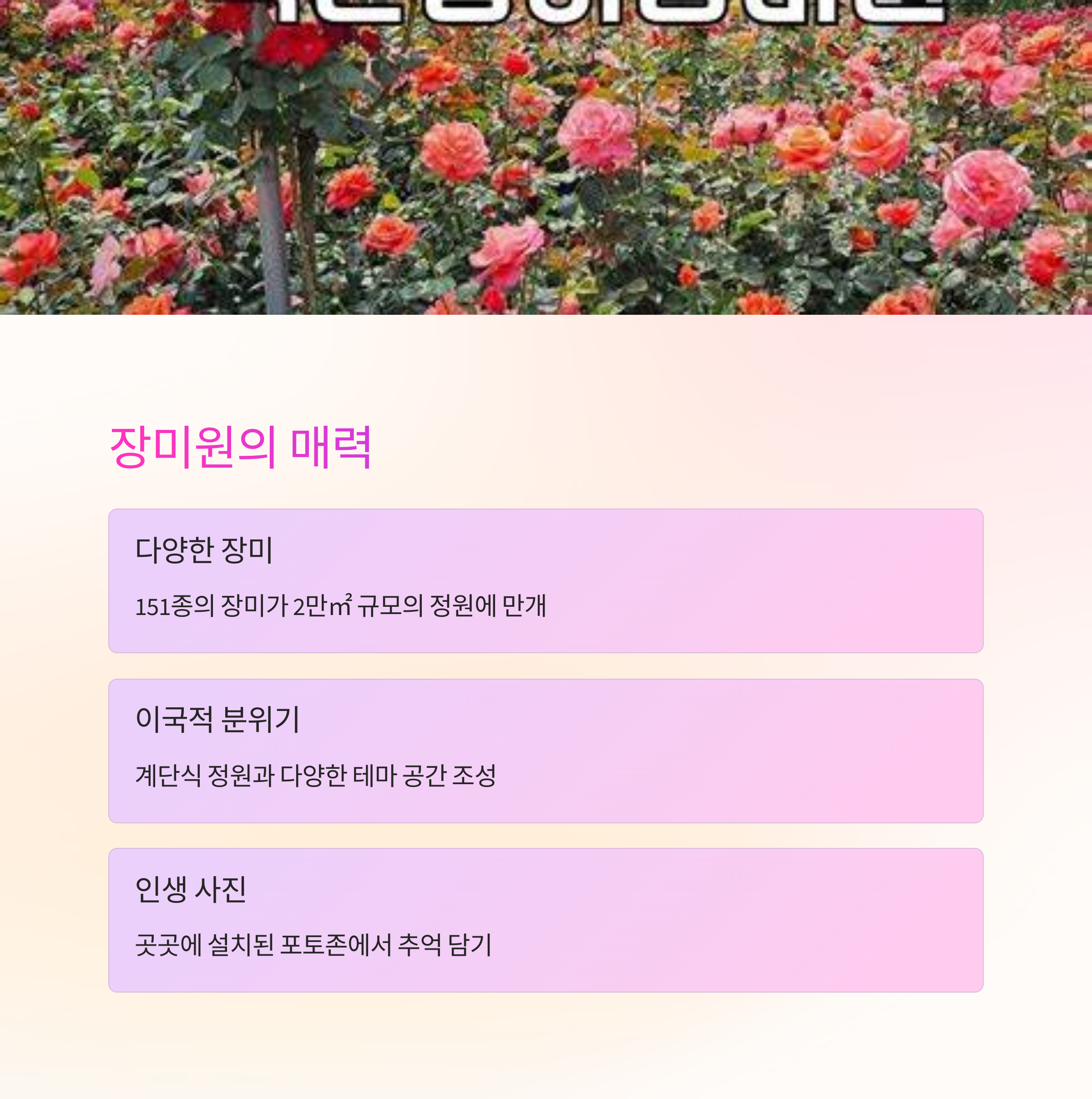 151종의 장미가 2만㎡ 규모의 정원에 만개하여 방문객들에게 이국적인 분위기와 향기로운 산책을 선사합니다.