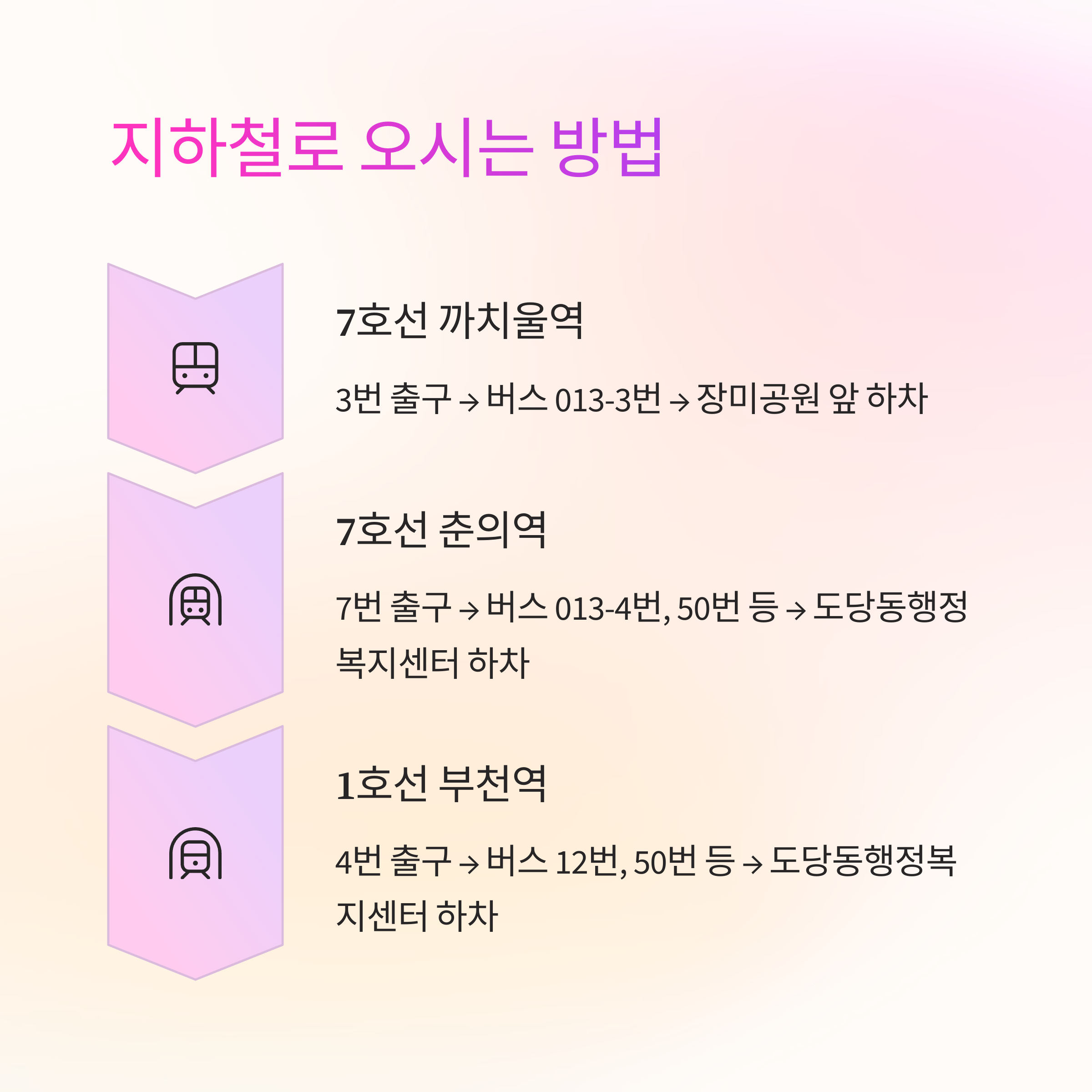 - 부천역 4번 출구 → 버스 12번, 50번, 70-2번, 661번 탑승 → 도당동행정복지센터 하차