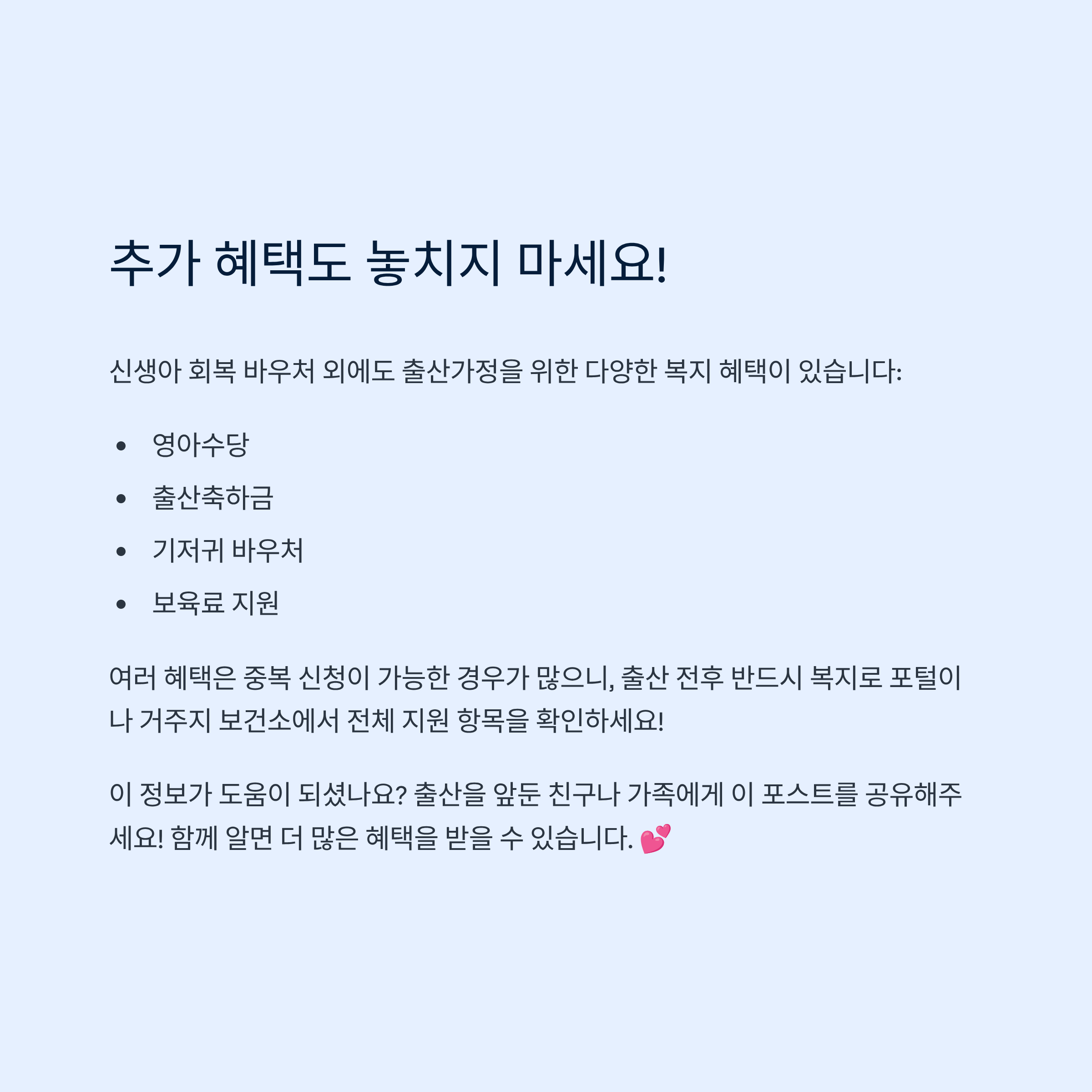 신생아 회복 바우처 외에도 출산가정을 위한 다양한 복지 혜택이